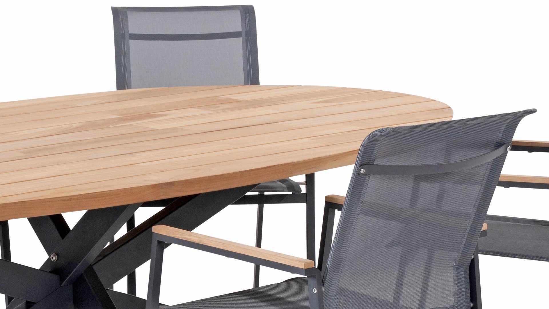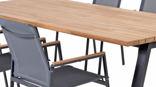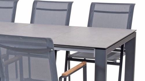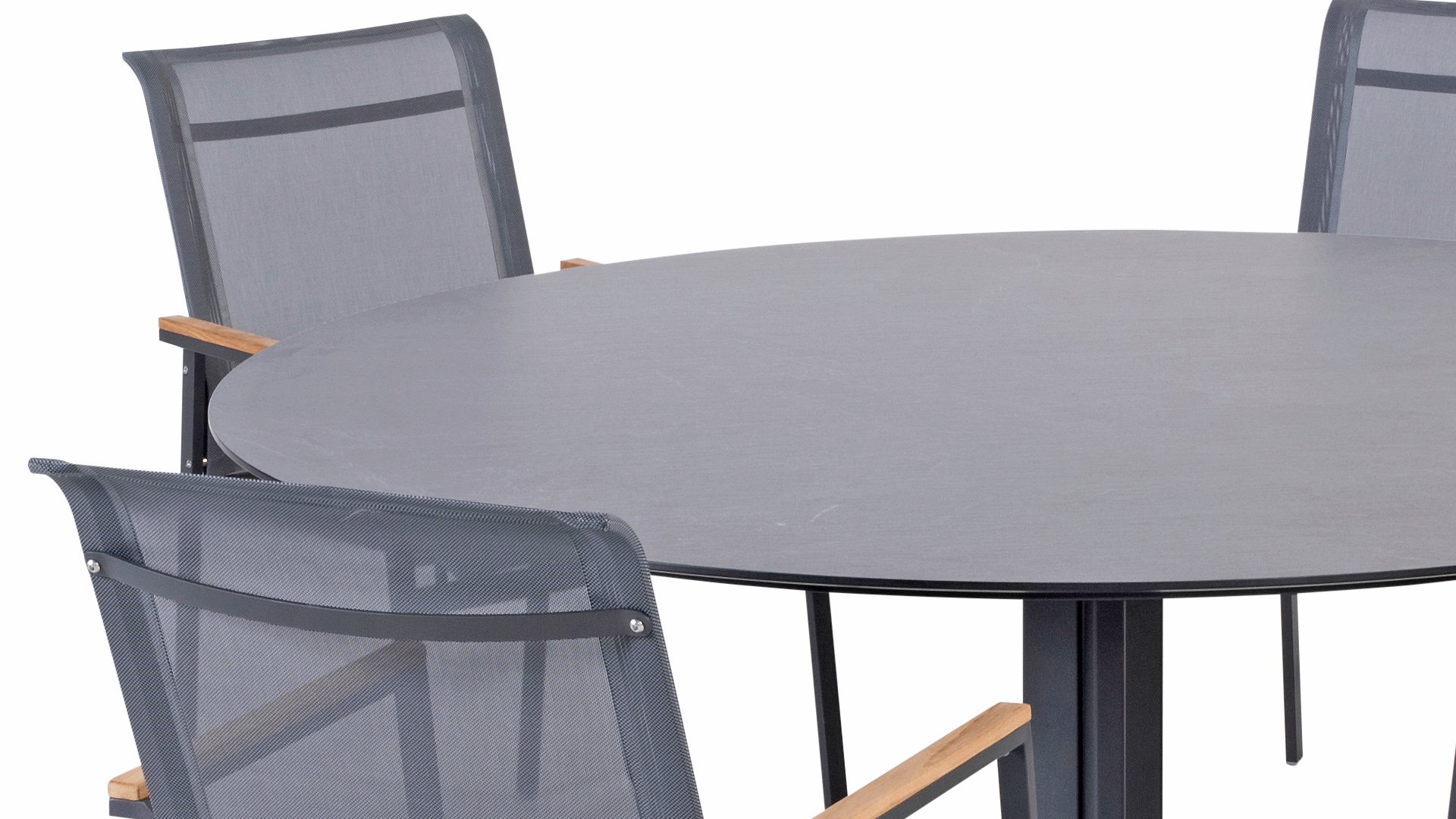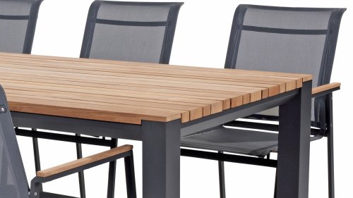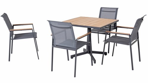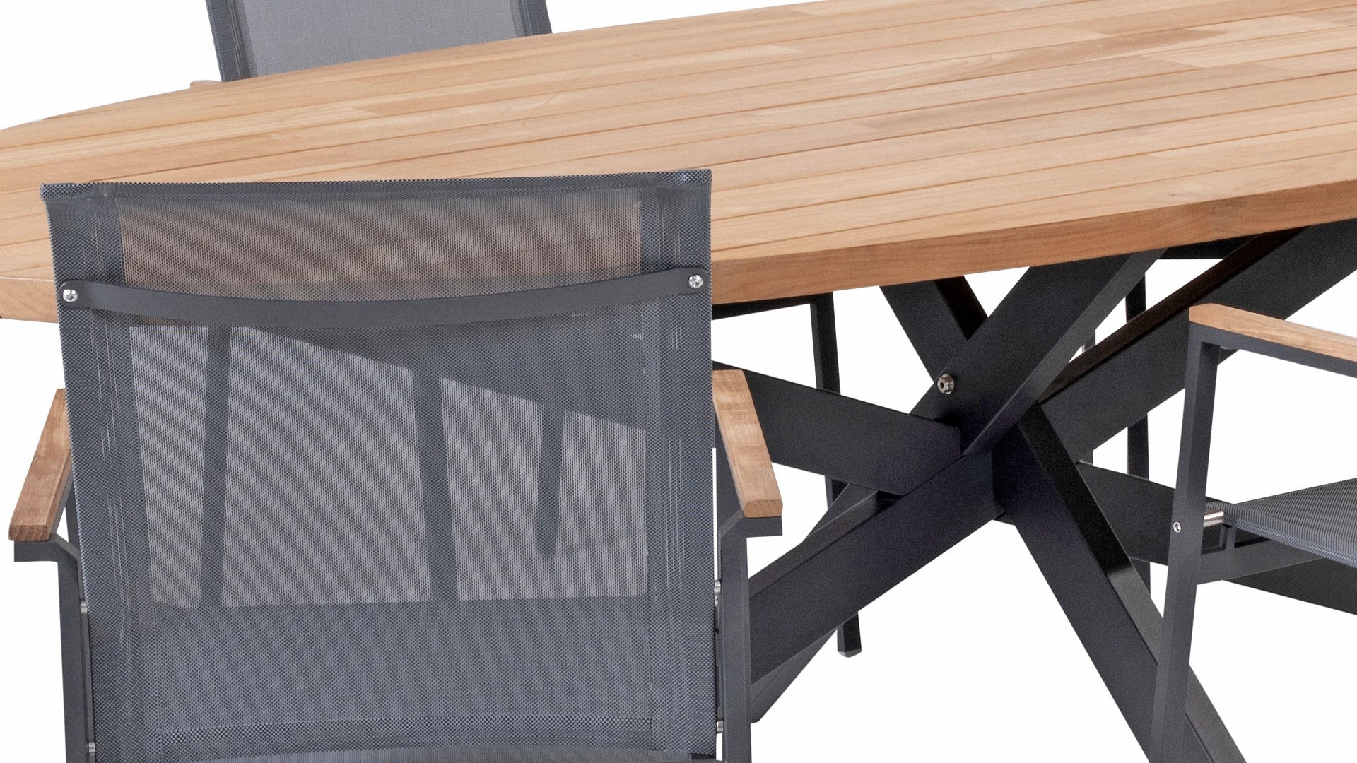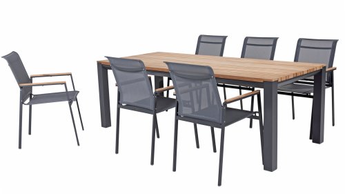 The Passion stackable chair has an anthracite powder-coated stainless steel frame and a textile seat and back. The armrest feels comfortable due to the teak accents, making it a beautiful combination with a garden table with an anthracite base and a teak table top. To give an example: The 4 Seasons Outdoor Goa garden table and Passion stackable chairs are a great combination!