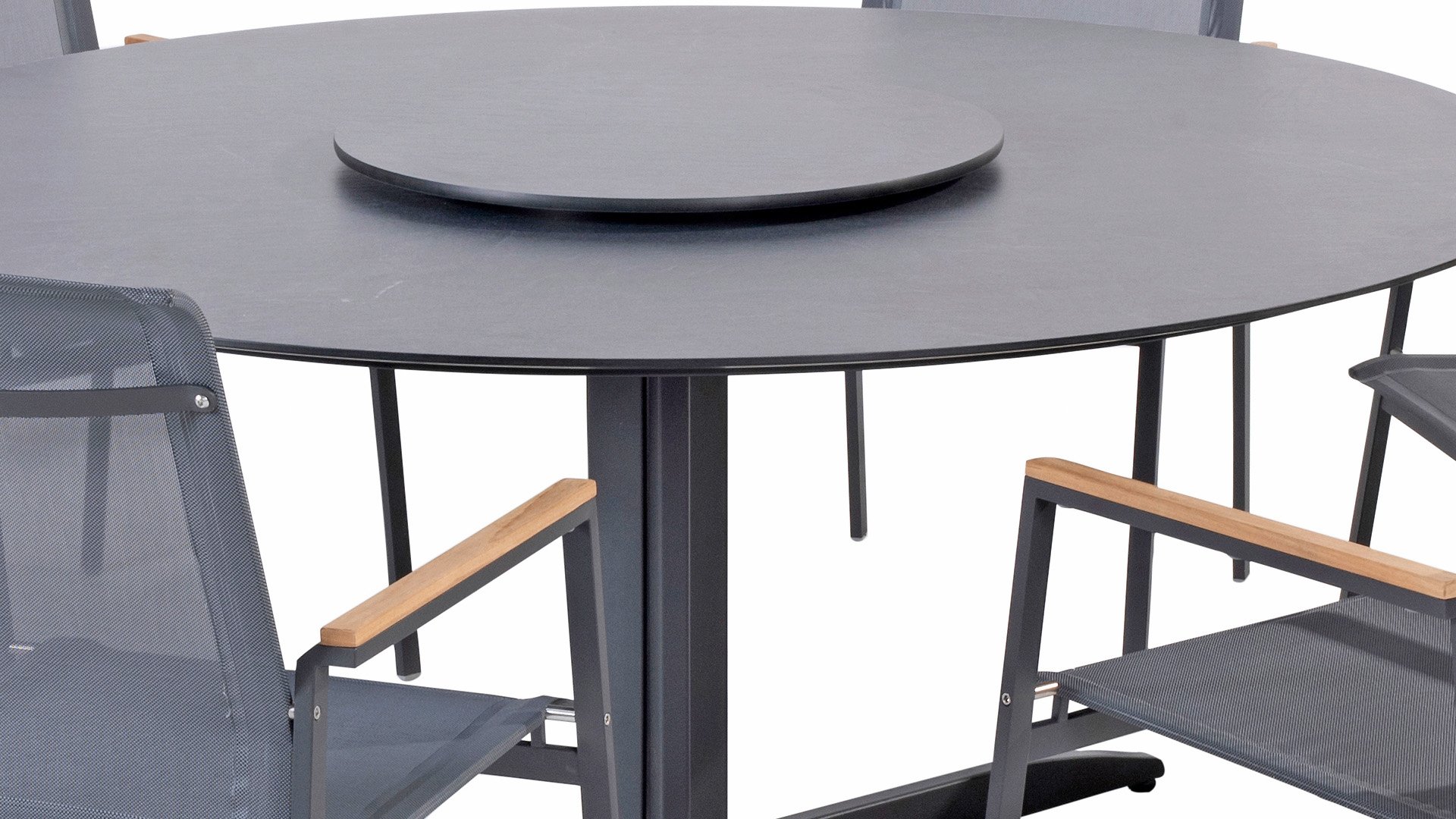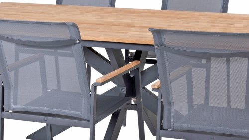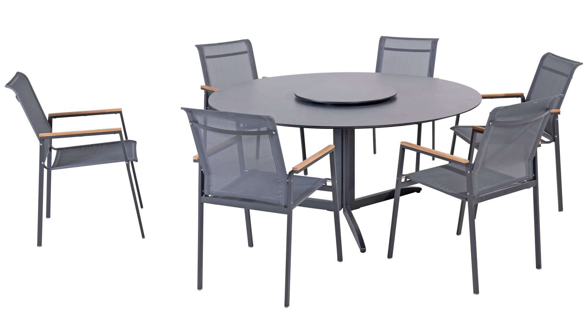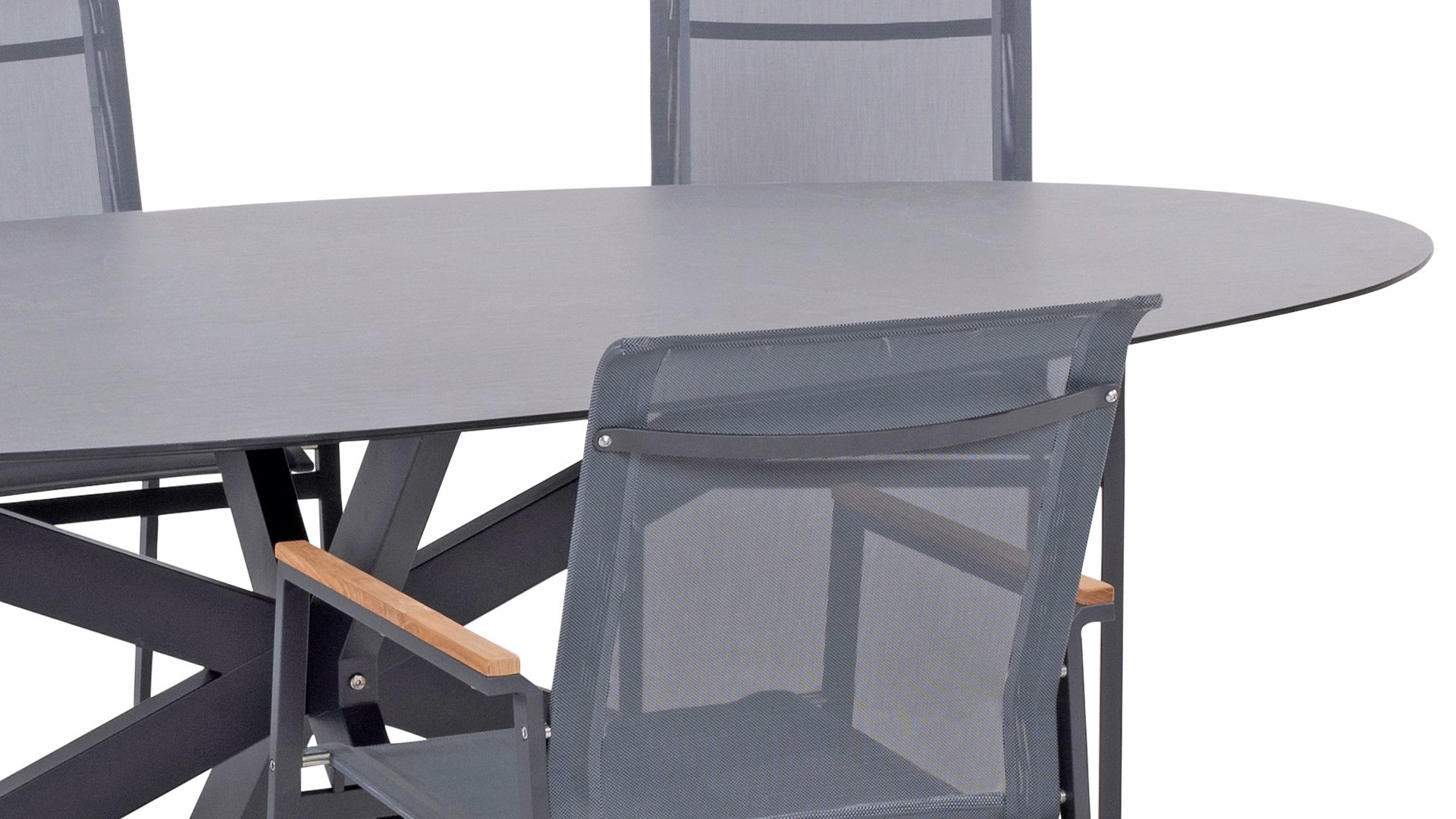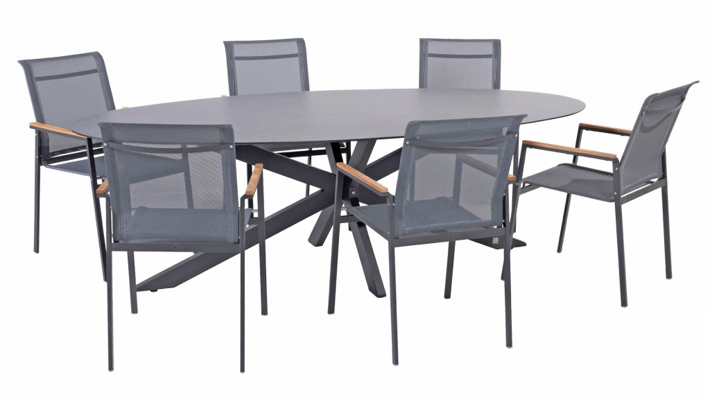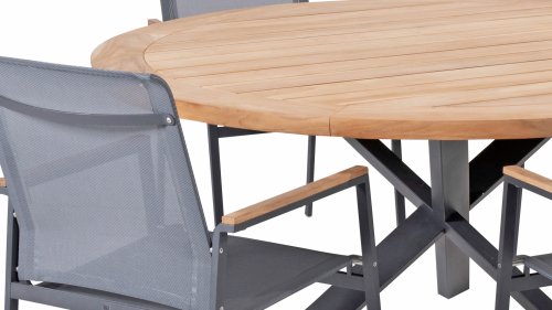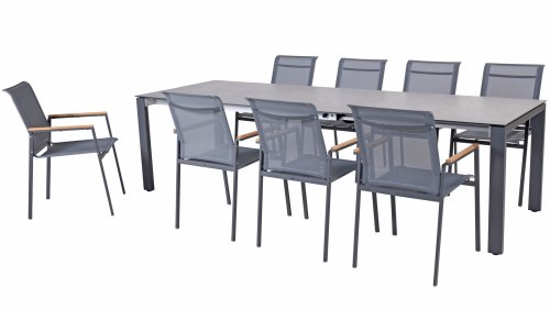 The Passion stackable chair has an anthracite powder-coated stainless steel frame and a textile seat and back. The armrest feels comfortable due to the teak accents, making it a beautiful combination with a garden table with an anthracite base and a teak table top. To give an example: The 4 Seasons Outdoor Goa garden table and Passion stackable chairs are a great combination!