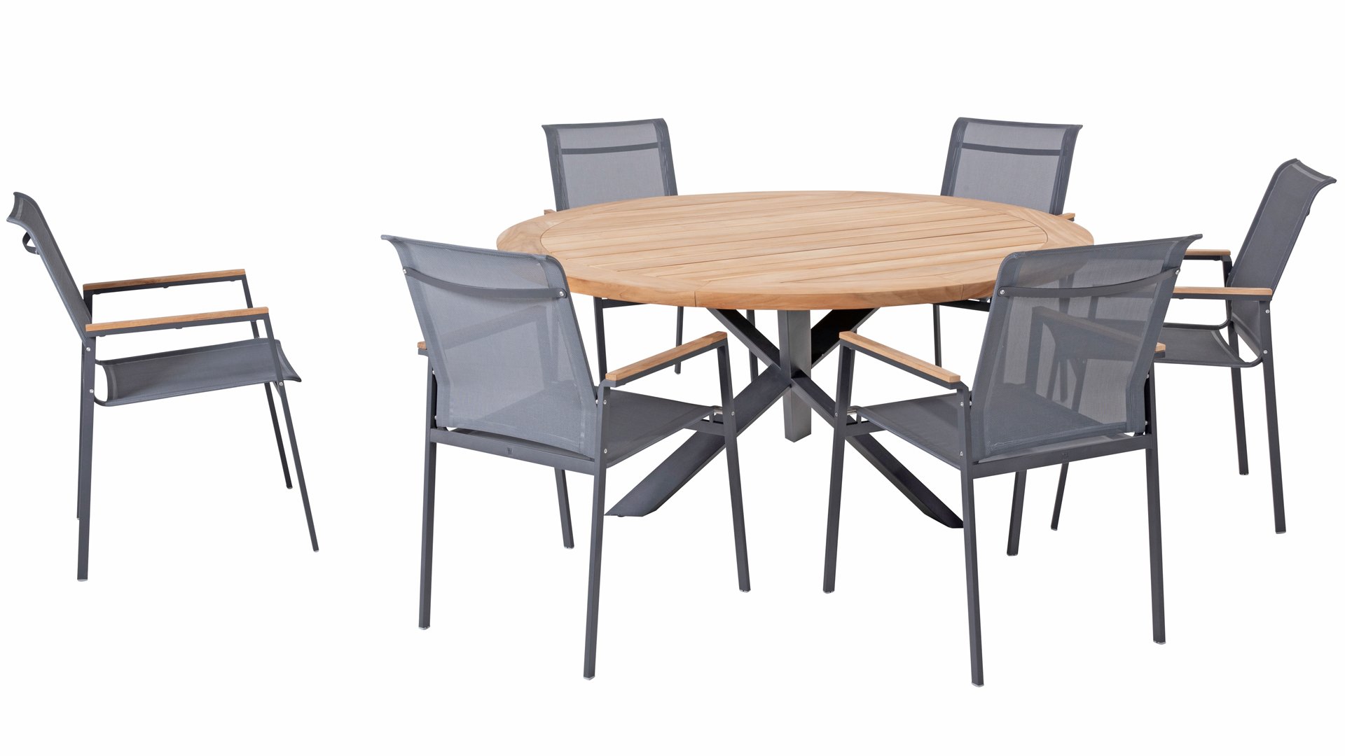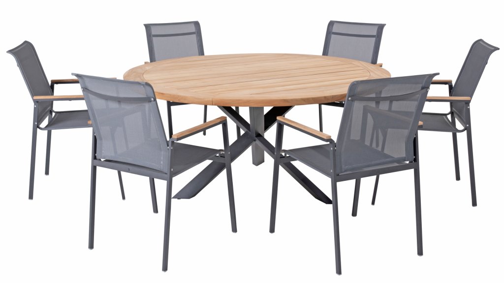 < p>6 x 4 Seasons Outdoor Passion stackable chair anthracite1 x Taste Prado table Ø160cm Teak-Alu Anthracite< /p> < p>Dim: ± 290x290x91cm (LxWxH)< /p> < p>The stackable chair from the 4 Seasons Outdoor Passion series is the perfect combination of high-quality anthracite powder-coated R.V.S., twitchell textilene and warm teak wood. Due to the interaction of the different materials, these chairs can be combined in various ways with different tables. If modern and functional design is what you are looking for, the 4 Seasons Outdoor Passion stackable chairs will definitely meet your needs. The strong and minimalist frame has a textilene seat and high backrest. Leave them outside all year round or easily stack them up and put them away.< /p> < p>You can easily call this table the top piece of the collection. The high-quality teak, in combination with the beautiful crossed leg, make this Taste by 4Seasons Prado 160cm table a gem. It can be combined with almost any dining chair from our collection, so there is something for everyone. Optionally, it can be combined with the Prado Lazy Susan.< /p>