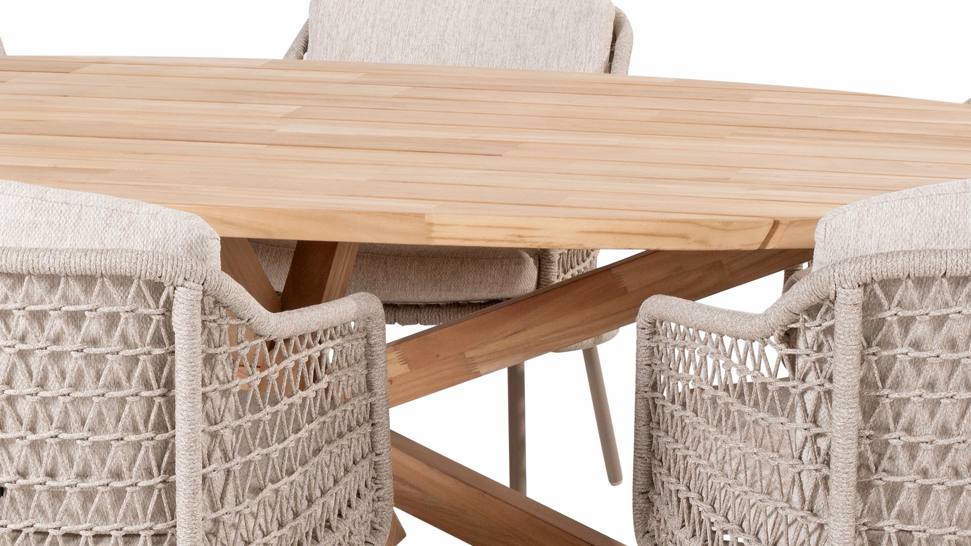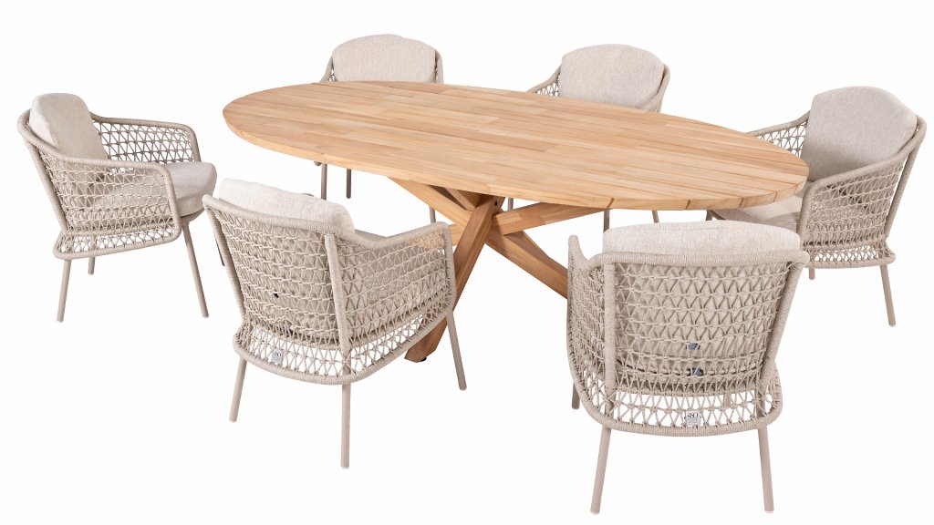 The Taste by 4Seasons Prado Ellips can certainly be called a work of art. Just look at how artistically that leg structure is put together. The thick teak wood top has an angled edge and gives the table a sense of lightness. It can be combined with our entire collection of garden chairs. Also available with anthracite, teak, latte, or terre base: