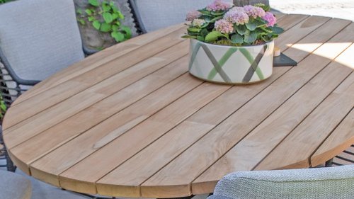 Teak is a natural product and particularly suitable for outdoor use. It is resistant to pests and mold and can withstand sun, rain, and snow. Over time, teak develops a silver-gray patina. Teak is a robust material and requires little maintenance. If you prefer the original color of your teak, you can easily prevent it from turning gray by regularly using our care product. You can also clean teak with green soap. We offer a warranty on all manufacturing and construction defects. This does not cover the working of teak. If you choose teak, we expect you to appreciate these qualities. Hairline cracks that may develop, knots in the teak, and rough surfaces or irregular discoloration over time are not covered by our warranty. These characteristics, which give teak its unique character and appearance, are part of its natural properties. Be careful with a flowerpot or vase on your teak garden table, as this can cause persistent rings or color variations. Imperfections are common; these imperfections are characteristic of this product. These irregularities can never give rise to a claim, warranty, or complaint. This is a mark of originality!