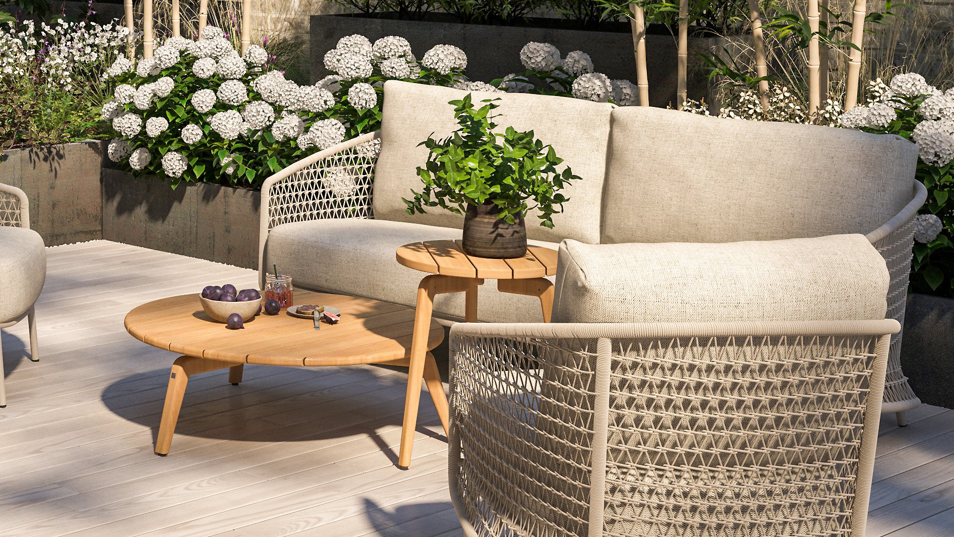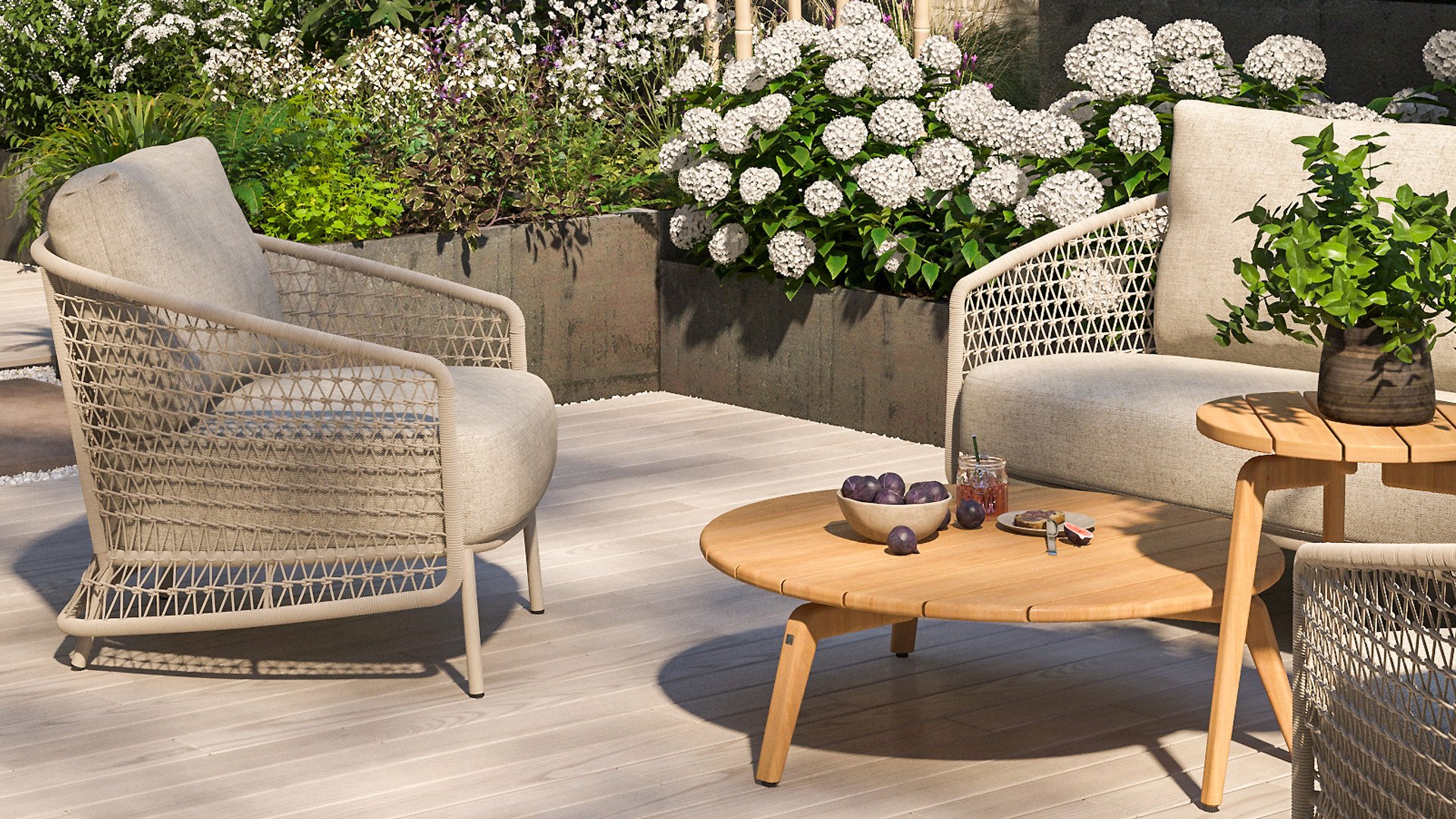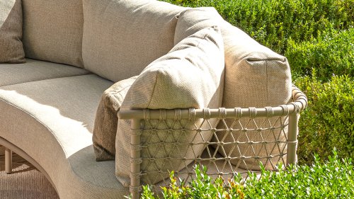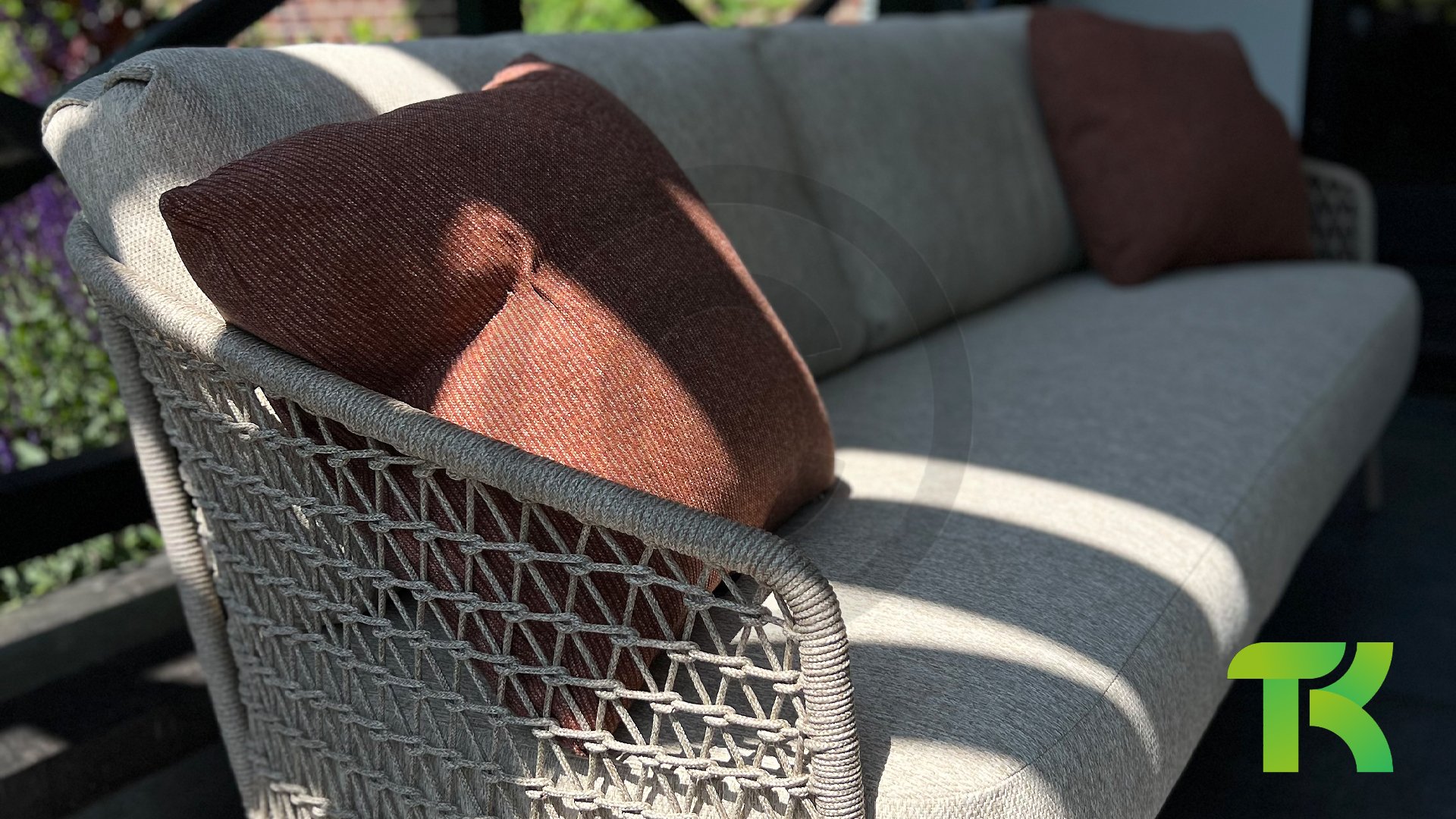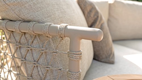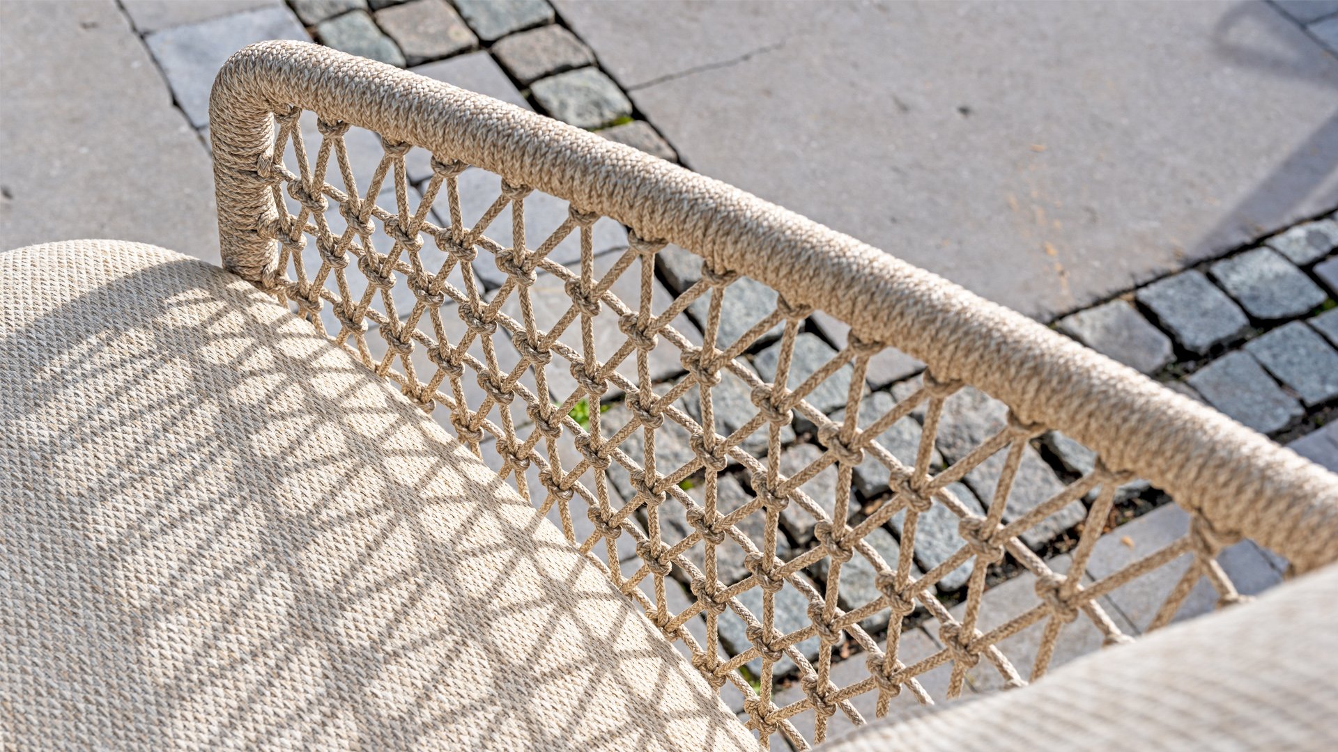 The Puccini series has a stainless steel base, combined with rope strings. Rope has a plastic core. This polypropylene base ensures that the rope stretches minimally and does not absorb any moisture. The casing is made of an acrylic fabric, similar to the weather-resistant fabric of our garden cushions. This casing feels soft but is very water-repellent, UV-resistant, and colorfast. The experienced 4SO weavers are able to weave exceptional knots and patterns with these materials. This is how we make garden furniture by 4 Seasons Outdoor extra special, and of very high quality!