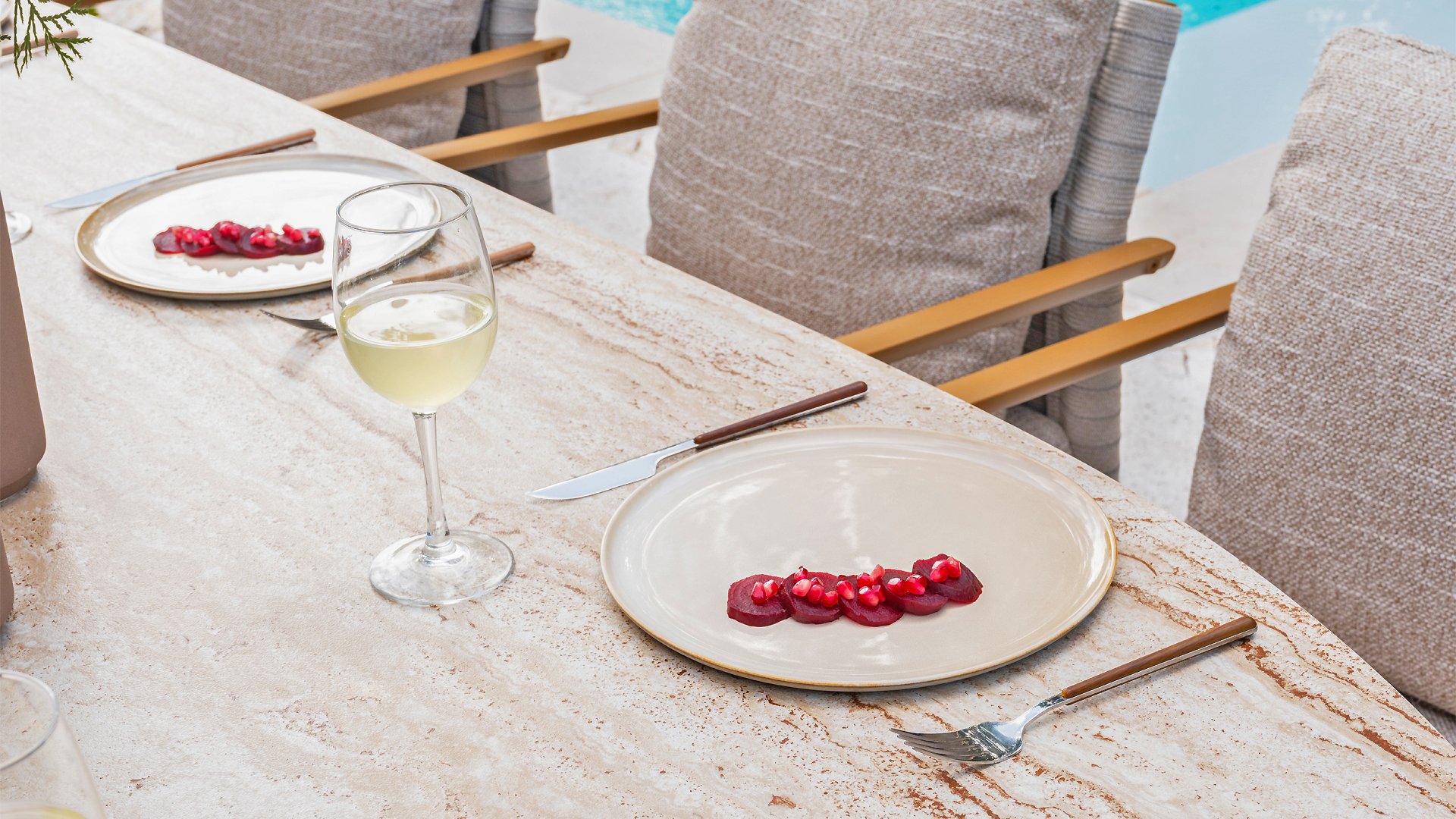 Mortex is made from a mixture of lime, cement, and fine mineral powders. Pigments and resins are added to this mixture to make it flexible, waterproof, and adhere well. It is applied by hand in thin layers and then sanded and finished with a protective sealer or wax. This creates a seamless, strong, and stylish surface suitable for furniture, floors, and walls, among other things. A Mortex garden table is weatherproof. Rain, sunlight, and temperature fluctuations have little effect on the material, provided the table is properly finished with a protective layer. It is important to be careful with acidic substances such as lemon juice, vinegar, or wine. If these remain on the surface for too long, they can damage the protective layer and cause stains.