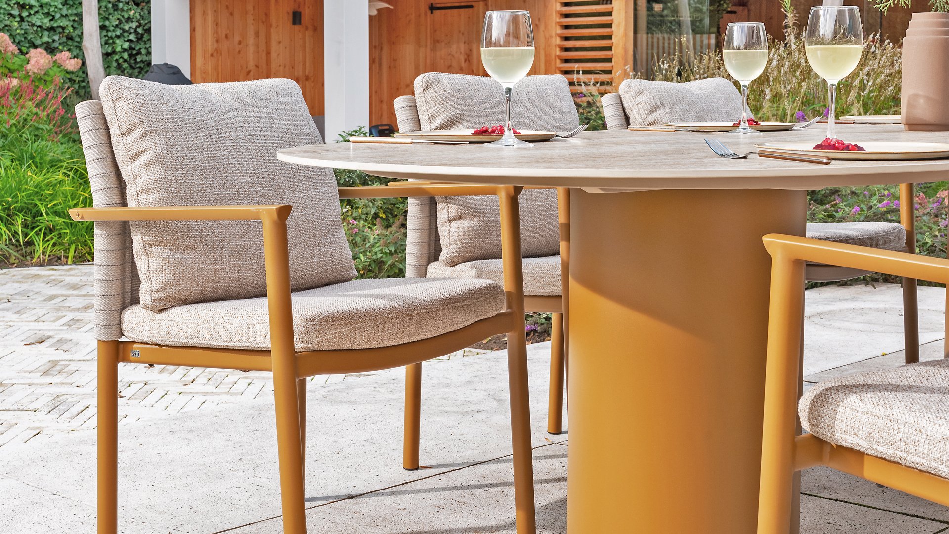 The 4 Seasons Outdoor Safina Amber Stackable Chair is a perfect choice for any outdoor space. Meet Safina, a true natural beauty. A design that is stunning from every angle. The new amber color is combined with calming earth tones for the perfect soothing look. The stitched rope in the backrest adds a unique detail and ensures ultimate comfort for many relaxing summer days in your garden.