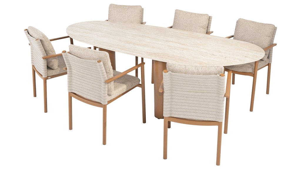 Bring luxury and functionality together in your garden or on your patio with the Estate table series from Taste by 4 Seasons Outdoor. These elegant tables are designed for those who appreciate sleek design, high-quality materials, and ultimate ease of use. The Taste Estate table immediately catches the eye with its subtly rounded, mango-shaped top – a refined twist on the classic rectangle, creating a natural, playful, and inviting look.The Estate is available with a ceramic and teak top. And that's not all; it's also available in two colors, including Latte & Amber. Do you prefer a maintenance-free table? Then the ceramic version is a better choice. Do you prefer a more natural touch? Then the teak top is more suitable. The robust base is made of powder-coated aluminum. The tripod base, consisting of three straight-down columns, gives the table a modern and stable base. View the tables below: