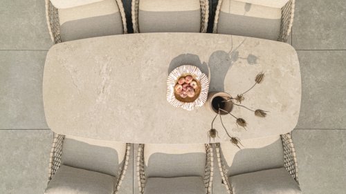 The Nevada table is a beautiful low-dining table that is perfect for outdoor living. With its false oval (barrel) ceramic top combined with a soft latte color base, it radiates warmth and coziness. The ceramic is ideal for outdoor use: it is durable, stain-resistant, and easy to clean. The base of the table is a modern cross base, which not only ensures stability but also gives a contemporary look. This design provides ample space for comfortable chairs, allowing you to relax during an informal meal or drinks with friends and family. With the low height of the Nevada low dining table, you create an informal, relaxed atmosphere that is perfect for long summer evenings in the garden or on the terrace. With its elegant shape and natural color, the Nevada table is a stunning addition to any outdoor space, ideal for enjoying life outdoors together!