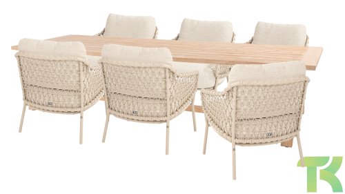 This stylish 4SO Sardinia Low Dining garden chair in the color latte/beige is perfect for any outdoor space. Made of high-quality powder-coated aluminum and rope wire, this chair combines durability with a modern look. With a factory guarantee of 5 years, you are assured of quality and long-term use. If you don't want to spend money on both a garden set and a lounge set, the truth lies in between. Kill two birds with one stone with the 4 Seasons Sardinia Low Dining!