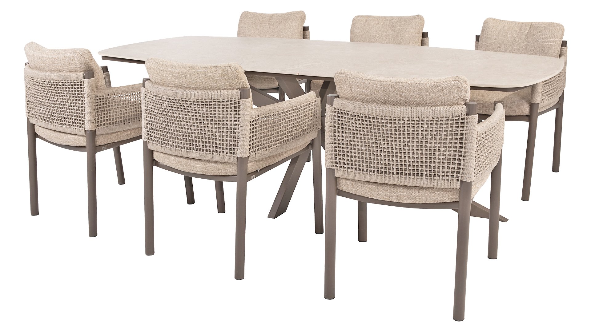 A beautiful, elegant table with a stunning oval ceramic top, available in either 240cm or 300cm. The top not only exudes refinement but also has a striking, modern look. The striking cross leg is available in three colors, allowing you to effortlessly tailor this table to your needs and preferences. Whether you choose industrial black, warm latte, or chic terre, each color adds a unique character and a touch of luxury to the table. With its generous dimensions, this table offers ample space for a cozy meal with friends or an intimate dinner with family. The combination of refined ceramics and the strong, stylish base ensures that this table is not only functional but also makes a stunning statement in your garden.