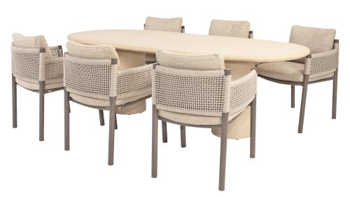 Meet Hampton: the perfect balance between refined elegance and robust simplicity. This beautiful garden table in a stylish beige/white hue exudes tranquility and luxury, and forms the heart of any outdoor space – from intimate dinners to long summer evenings with friends and family. The Hampton is crafted from high-quality Mortex, a durable and waterproof material known for its natural look and exceptional weather resistance. Each tabletop is hand-finished, creating a unique, warm look that effortlessly complements both modern and Mediterranean gardens. The table is available in various sizes, so there's always a Hampton to suit your outdoor living space. Choose the round Ø160cm version for a cozy setting with a single, elegant central leg, or opt for the generous oval 240cm or 300cm versions, both featuring two sleek, vertical legs that provide stability and a bold, linear design. For those who prefer a more relaxed dining experience, there's also a low-dining version Ø160cm, ideal for relaxing moments in lounge style.