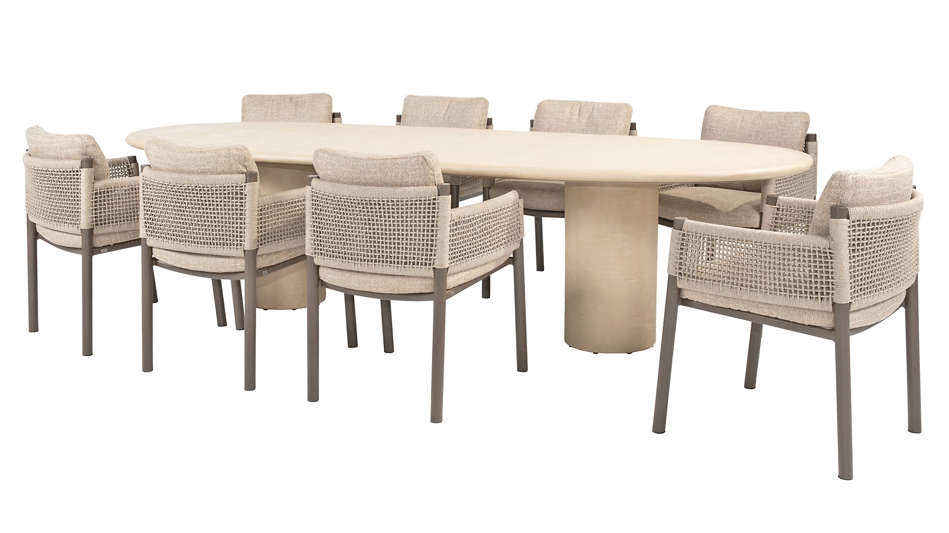 Meet Hampton: the perfect balance between refined elegance and robust simplicity. This beautiful garden table in a stylish beige/white hue exudes tranquility and luxury, and forms the heart of any outdoor space – from intimate dinners to long summer evenings with friends and family. The Hampton is crafted from high-quality Mortex, a durable and waterproof material known for its natural look and exceptional weather resistance. Each tabletop is hand-finished, creating a unique, warm look that effortlessly complements both modern and Mediterranean gardens. The table is available in various sizes, so there's always a Hampton to suit your outdoor living space. Choose the round Ø160cm version for a cozy setting with a single, elegant central leg, or opt for the generous oval 240cm or 300cm versions, both featuring two sleek, vertical legs that provide stability and a bold, linear design. For those who prefer a more relaxed dining experience, there's also a low-dining version Ø160cm, ideal for relaxing moments in lounge style.