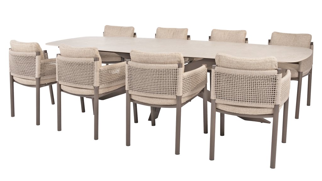 A beautiful, elegant table with a stunning oval ceramic top, available in either 240cm or 300cm. The top not only exudes refinement but also has a striking, modern look. The striking cross leg is available in three colors, allowing you to effortlessly tailor this table to your needs and preferences. Whether you choose industrial black, warm latte, or chic terre, each color adds a unique character and a touch of luxury to the table. With its generous dimensions, this table offers ample space for a cozy meal with friends or an intimate dinner with family. The combination of refined ceramics and the strong, stylish base ensures that this table is not only functional but also makes a stunning statement in your garden.
