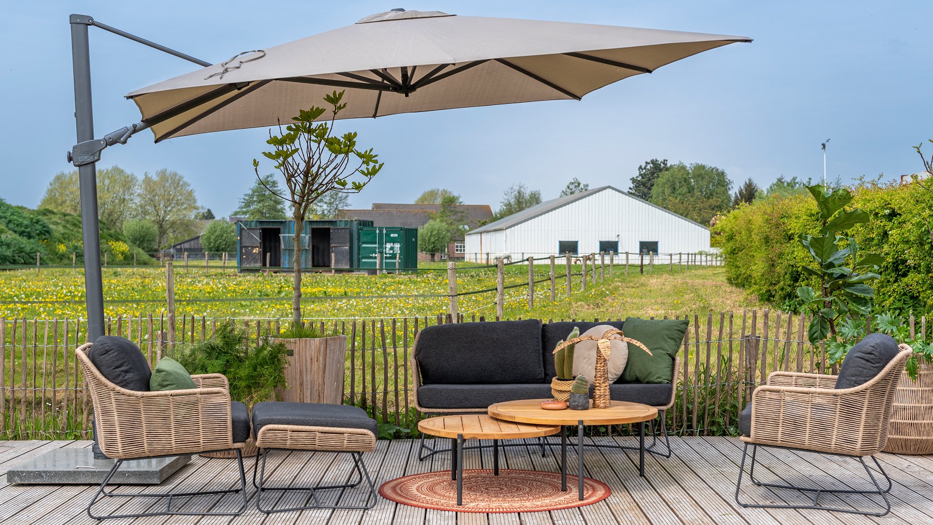4Seasons Outdoor Siesta is a high-quality cantilever umbrella. Made from an aluminum frame, it stands for heavy quality. The fabric is made of Solefin. This material is characterized by its high colorfastness and durability. Standard 5-year warranty.