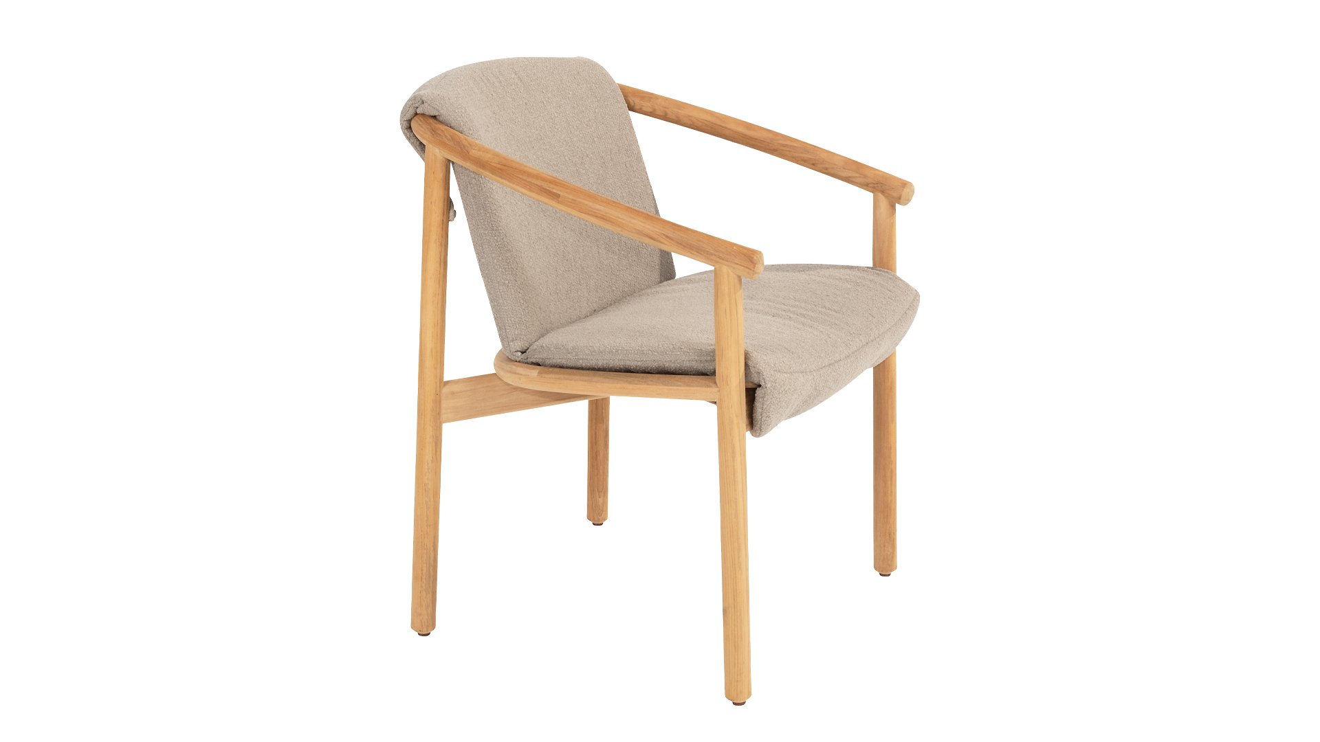 The chair's cushion is made of Olefin and woven in Bouclé for added elegance. The taupe-colored cushion adds a soothing, neutral tone that complements the natural look of the teak wood frame. The cushion is attached to the teak wood frame at 4 points.