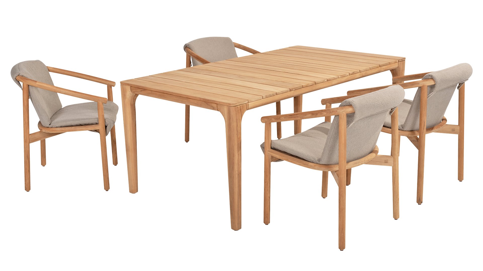 The cushion of the chair is made of Olefin and is woven in Bouclé for added elegance. The taupe-colored cushion adds a calming, neutral tone that complements the natural look of the teak frame. The cushion is fastened at 4 points to the teak frame. With the 4SO Tess dining, you acquire a true eye-catcher that brings your garden or terrace to life.