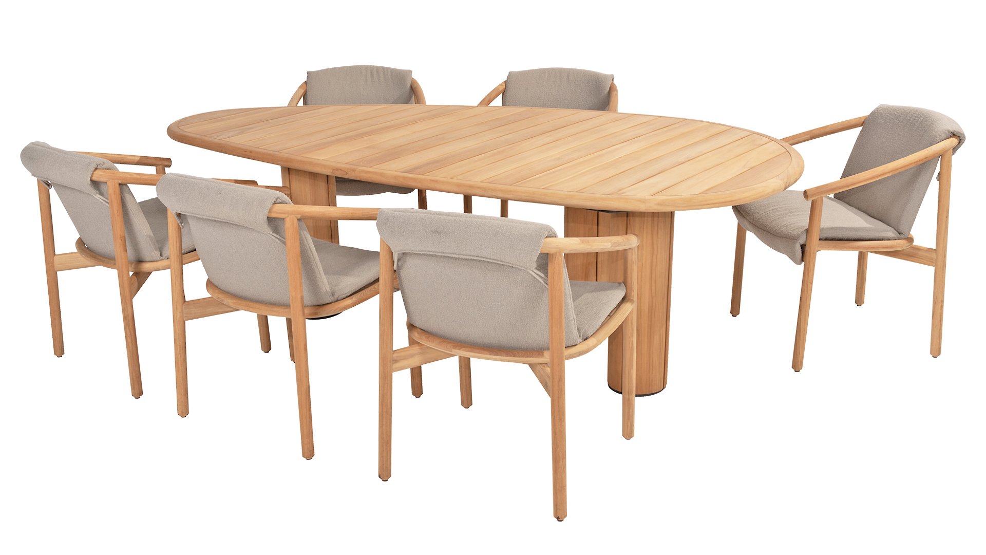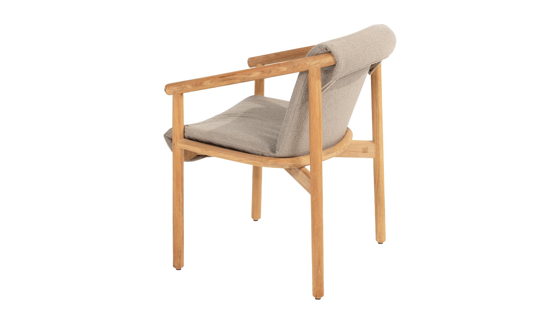 The cushion of the chair is made of Olefin and is woven in Bouclé for added elegance. The taupe-colored cushion adds a calming, neutral tone that complements the natural look of the teak frame. The cushion is fastened at 4 points to the teak frame. With the 4SO Tess dining, you acquire a true eye-catcher that brings your garden or terrace to life.
