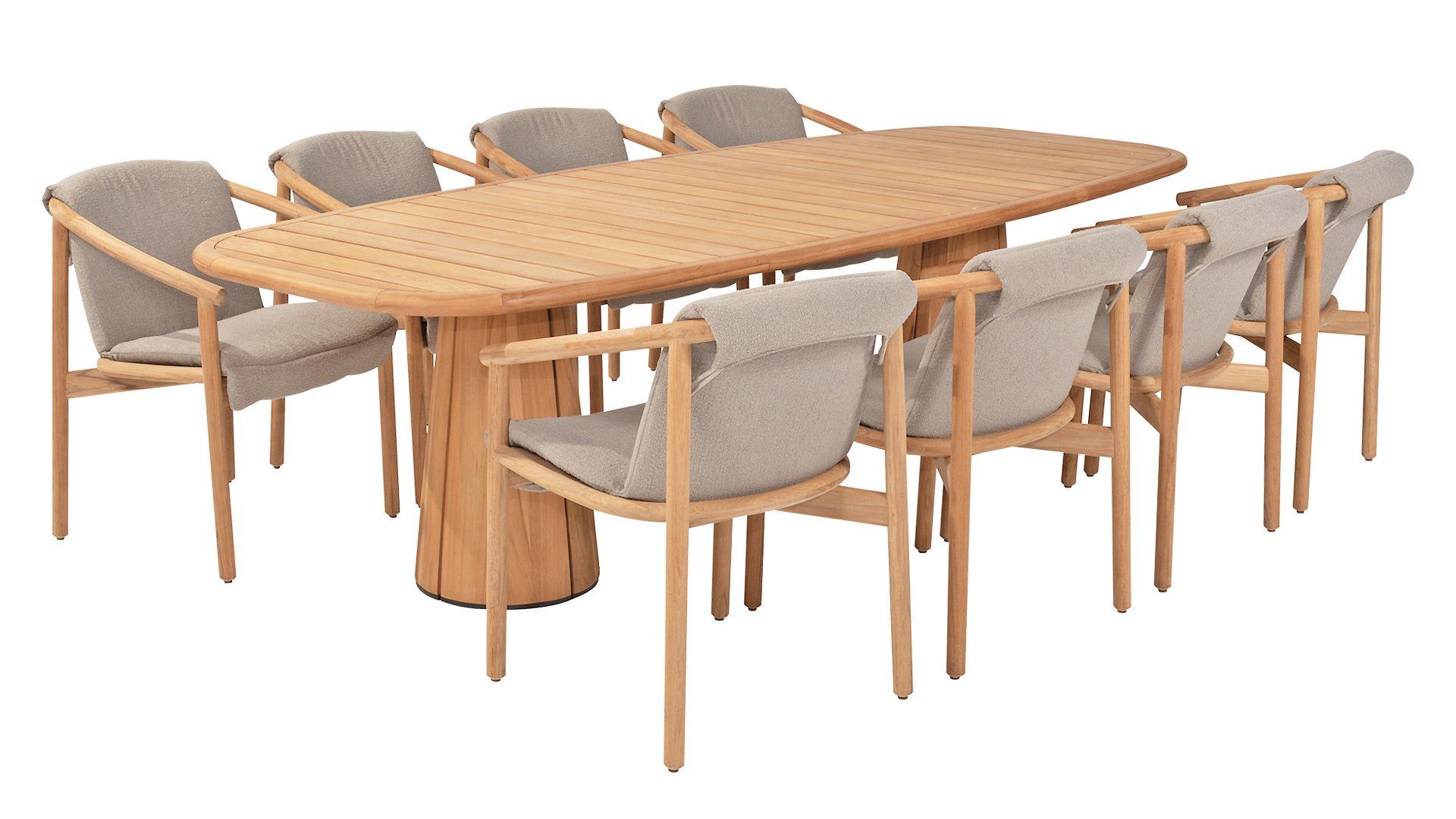 The cushion of the chair is made of Olefin and is woven in Bouclé for added elegance. The taupe-colored cushion adds a calming, neutral tone that complements the natural look of the teak frame. The cushion is fastened at 4 points to the teak frame. With the 4SO Tess dining, you acquire a true eye-catcher that brings your garden or terrace to life.