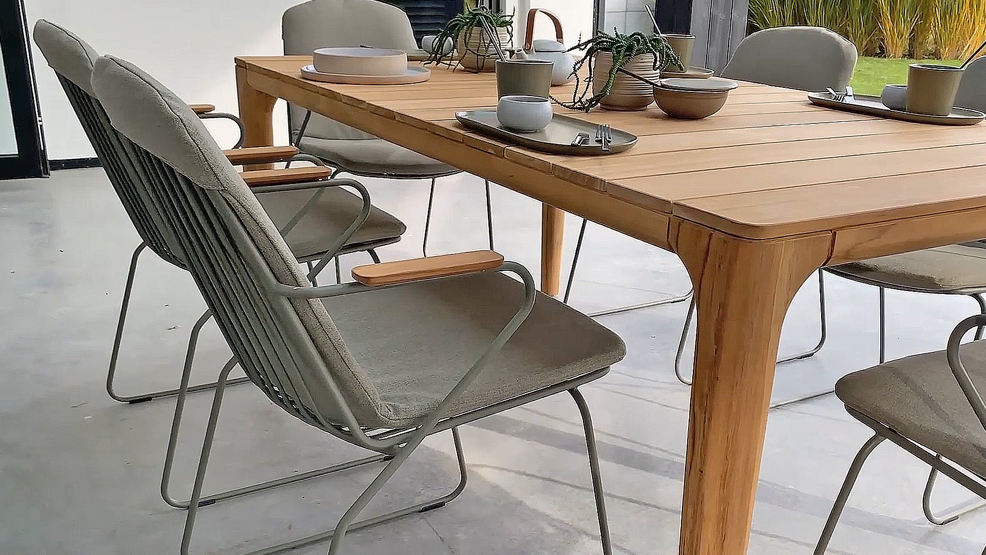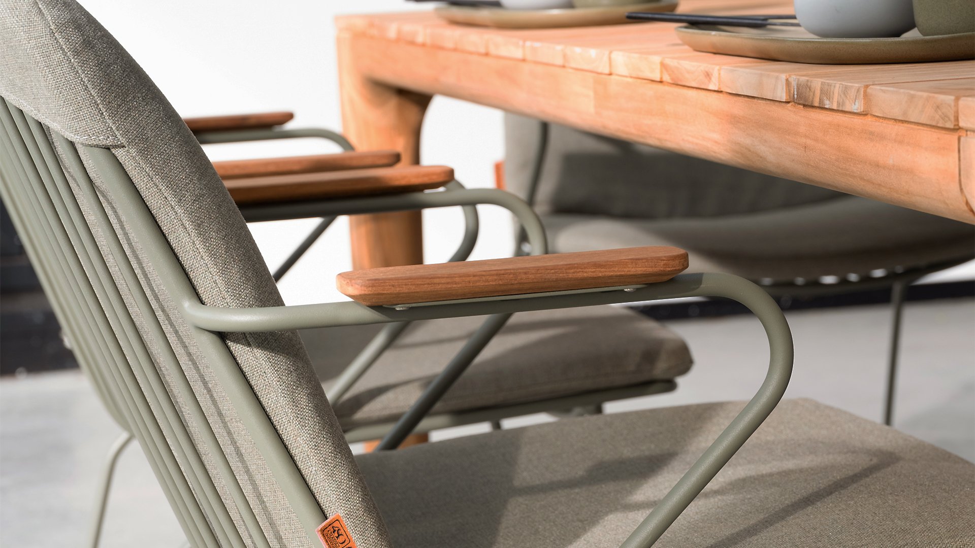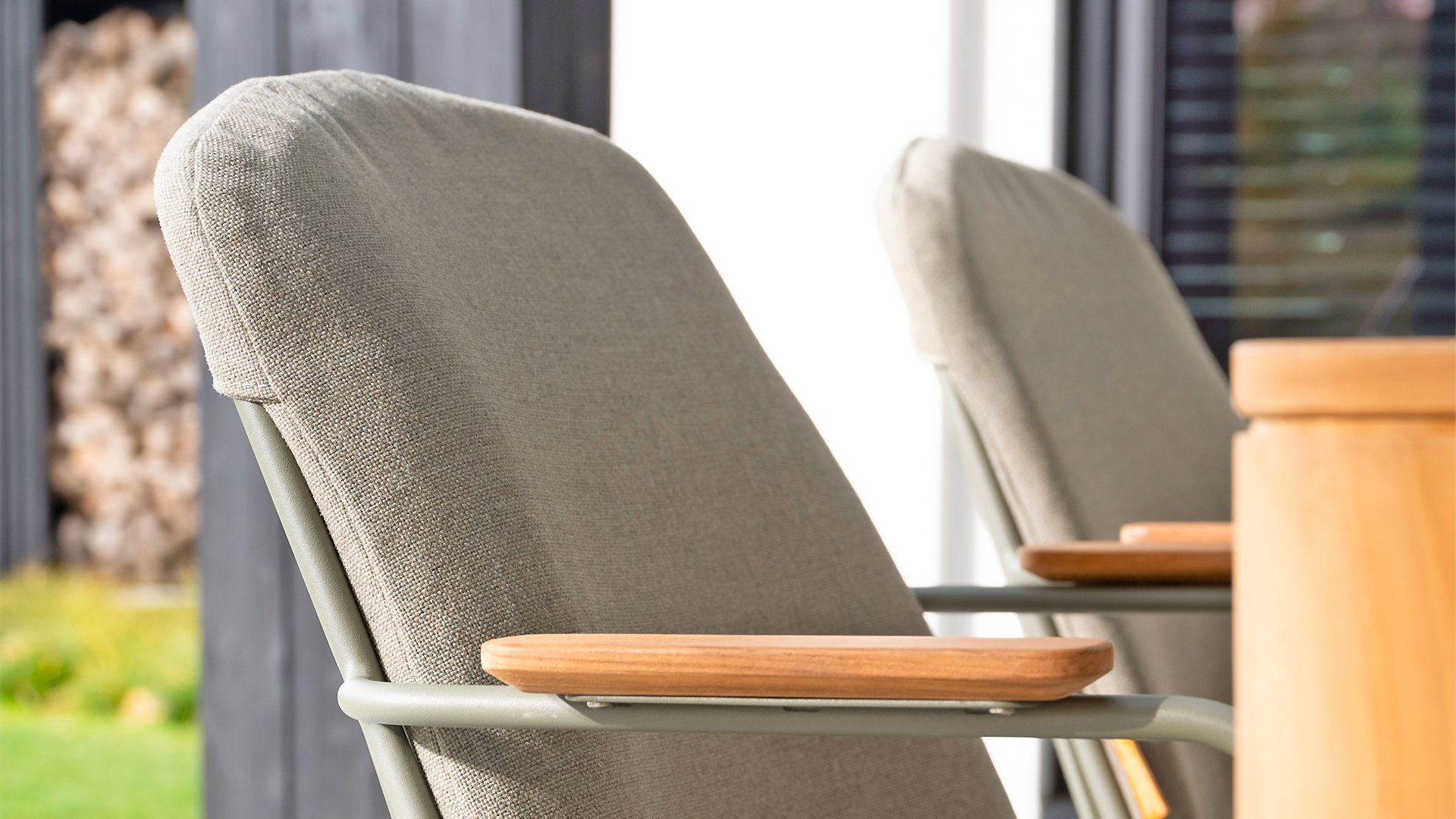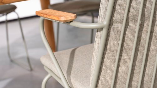 There is nothing like 4SO Veneto Unique in its kind, the minimalist Veneto dining chair made of thin stainless steel pipes available in the colors Anthracite & Olive. An ergonomic design, teak armrests, and the cushion that you easily slide over the backrest. Veneto is also stackable, truly a one-of-a-kind dining chair.
