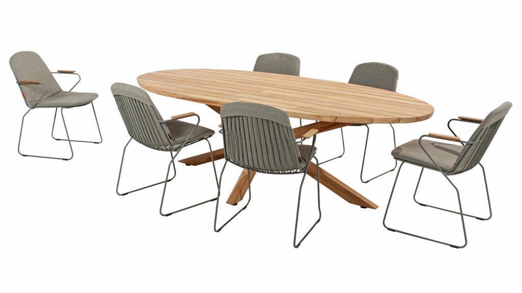 The Taste by 4Seasons Prado Ellipsus can safely be called a work of art. Just look at how artfully that leg set fits together. The thick teak wood top has an inclined side and gives the table an airy look. Can be combined with our entire collection of garden chairs. The Prado Ellipsus is also available with anthracite aluminum legs.