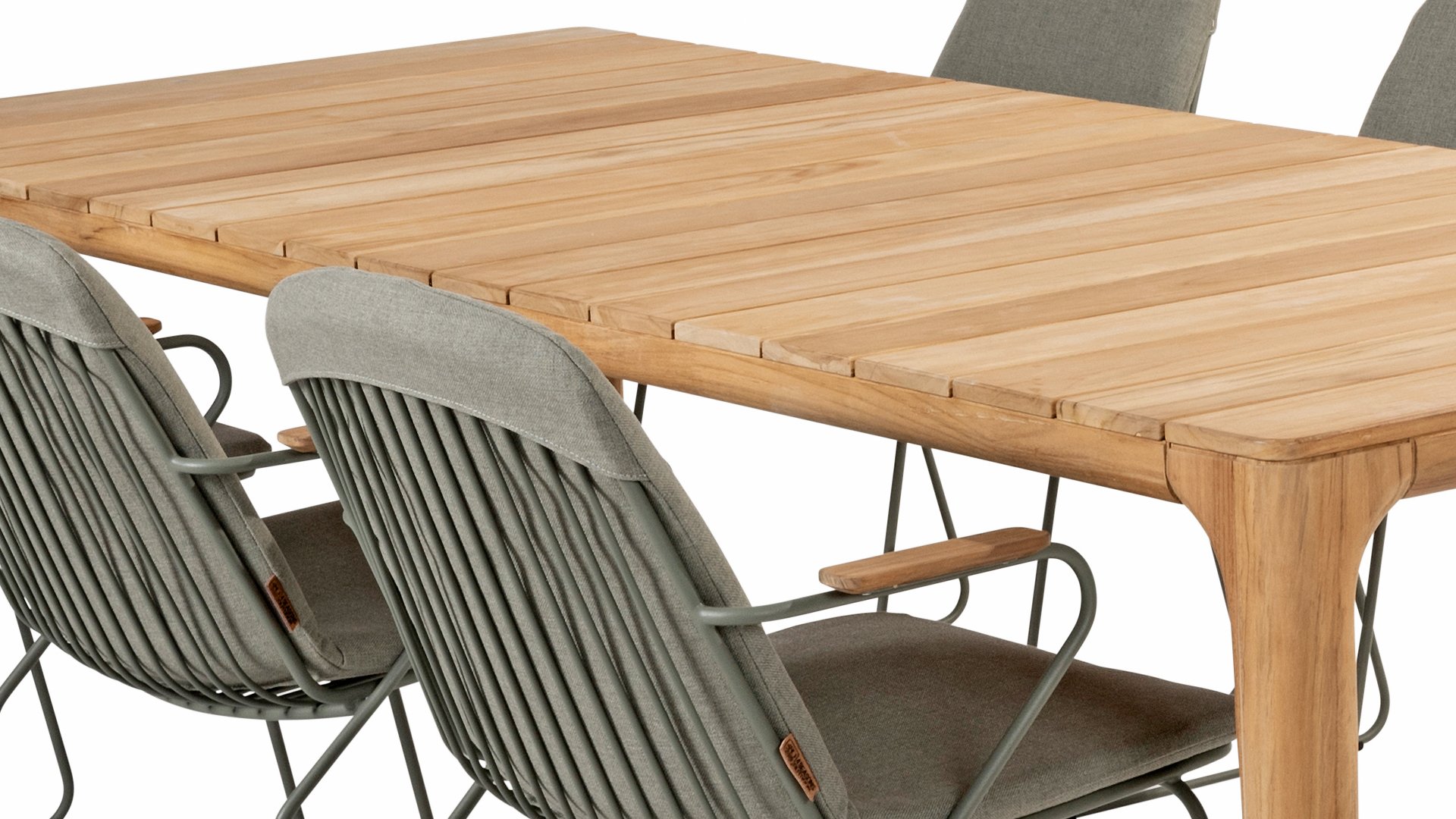 The Liam table from Taste 4SO has an elegant design that is definitely noticed when it is in a space. The tabletop stands out because the slats are placed across the width. This tabletop sets it apart from most other tables and provides a contemporary and original look. The Liam table has a beautiful, elegant base that beautifully complements the tabletop. The table is made entirely of teakwood, can remain outside all year round, and is also available in size 180. View the Taste 4Seasons Liam 180cm here.