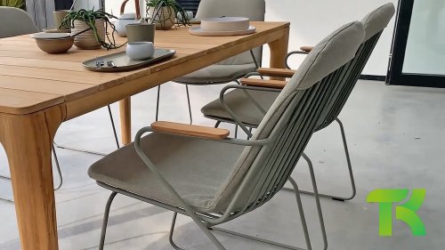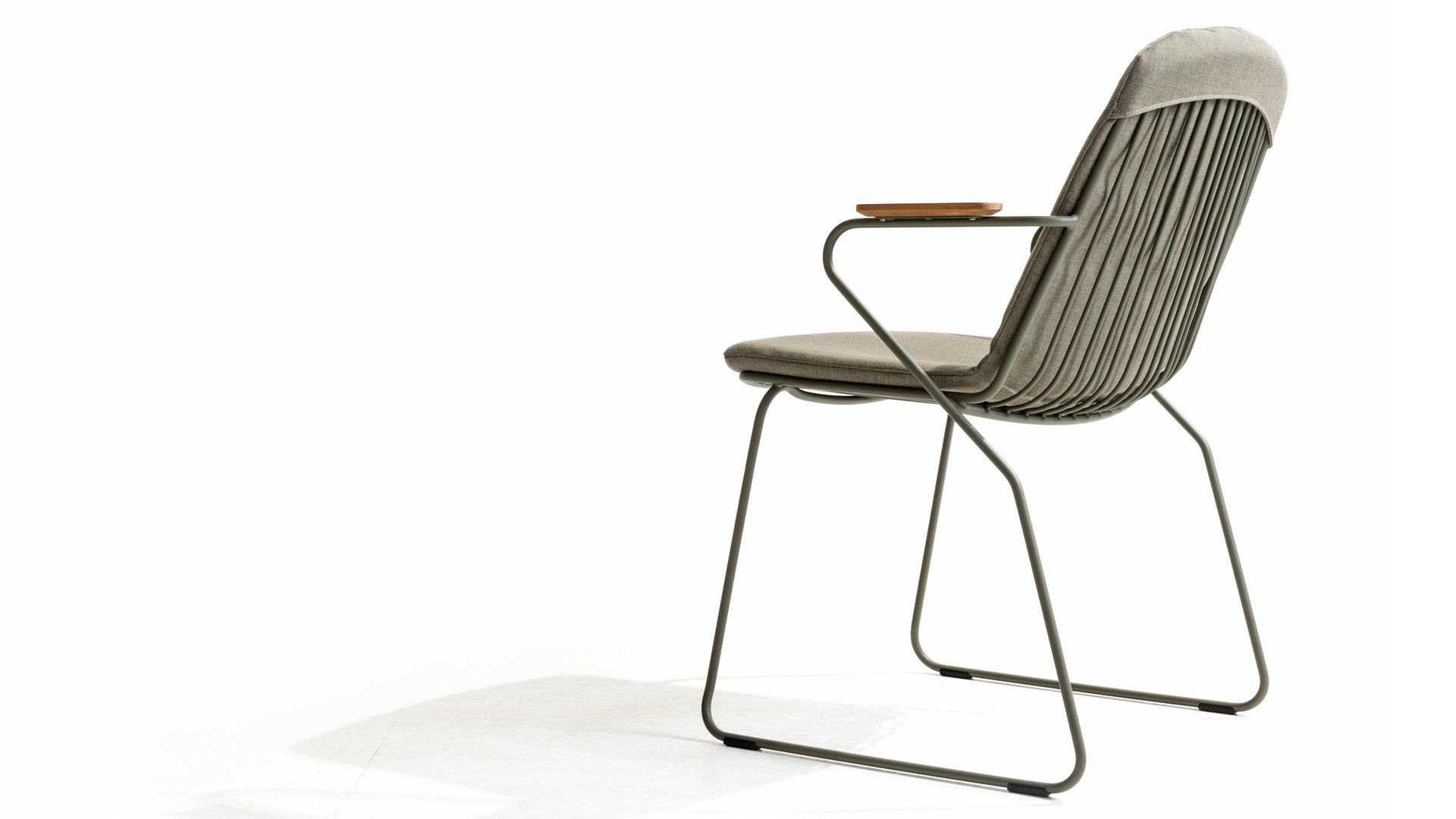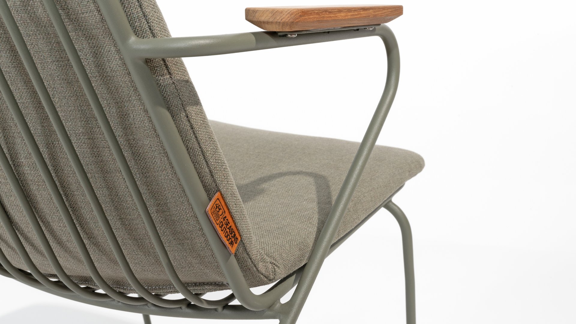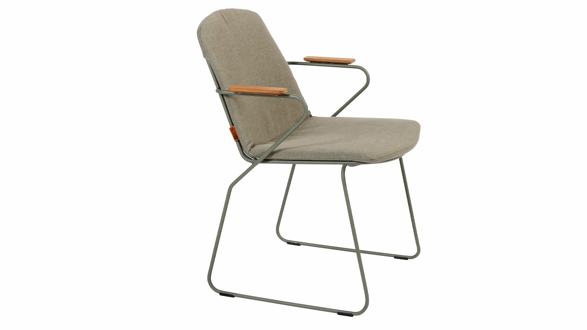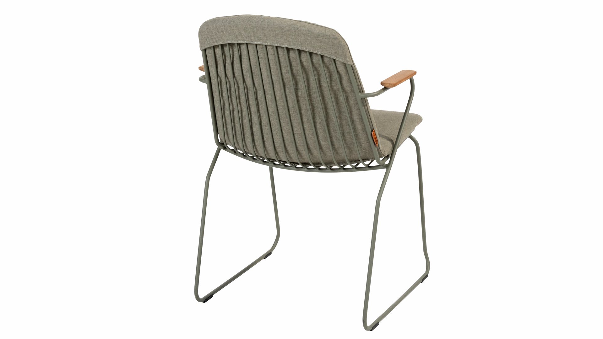 There is nothing like 4SO Veneto. Unique in its kind, the minimalist Veneto dining chair made of thin stainless steel tubes, available in the colors Anthracite & Olive. An ergonomic design, teak armrests, and the cushion that easily slides over the backrest. Veneto is also stackable, truly a one-of-a-kind dining chair.
