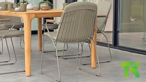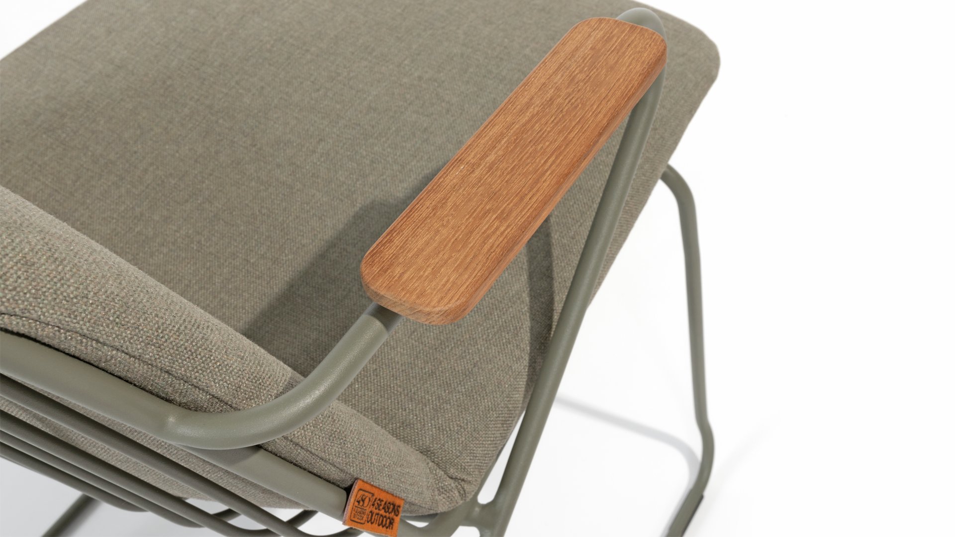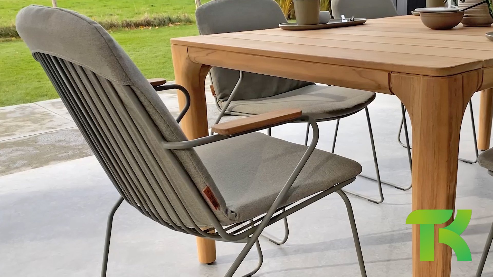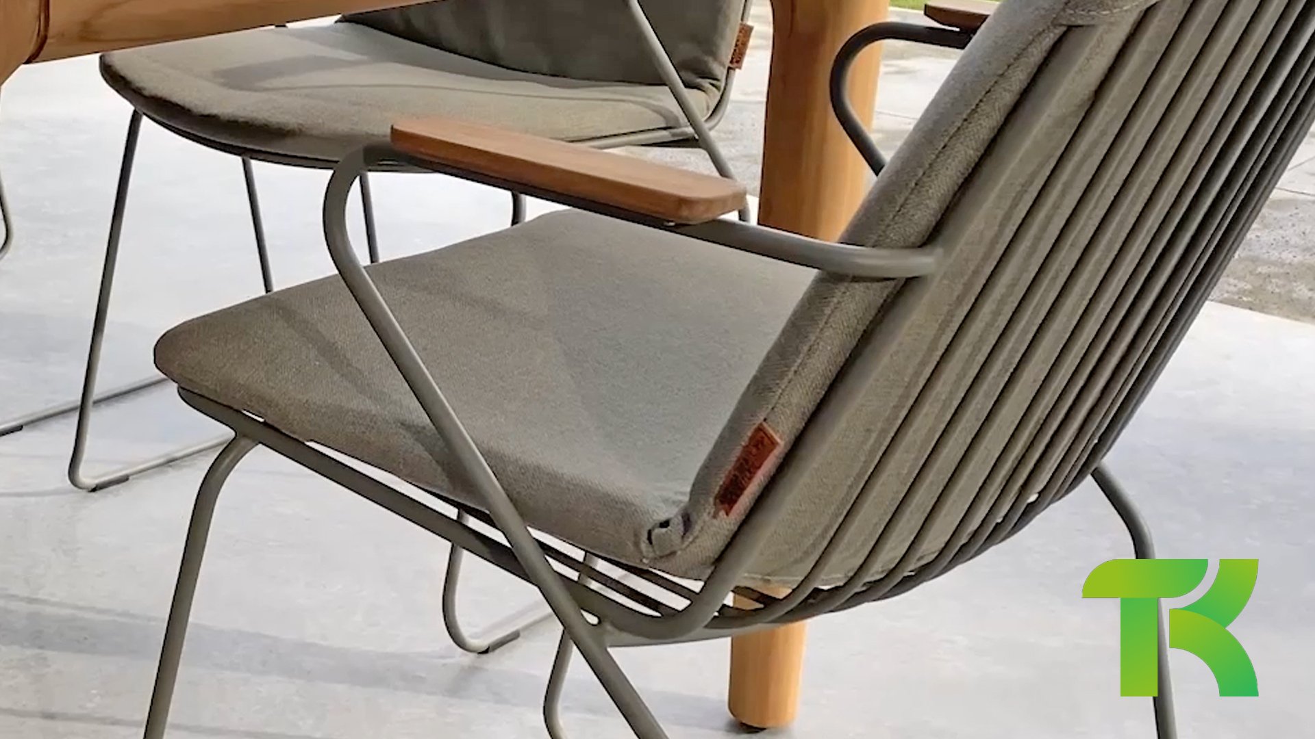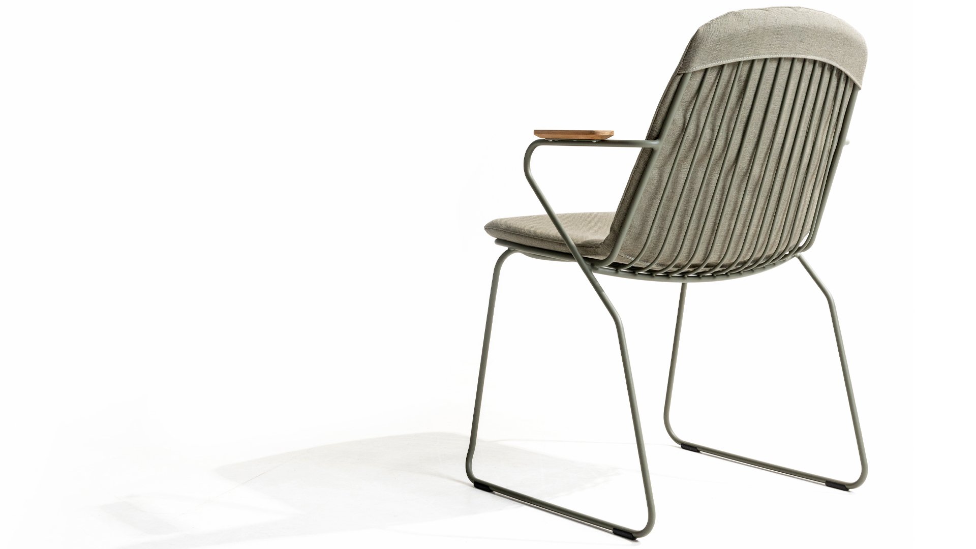 There is nothing like 4SO Veneto. Unique in its kind, the minimalist Veneto dining chair made of thin stainless steel tubes, available in the colors Anthracite & Olive. An ergonomic design, teak armrests, and the cushion that easily slides over the backrest. Veneto is also stackable, truly a one-of-a-kind dining chair.