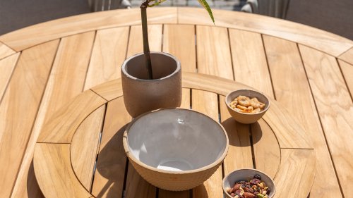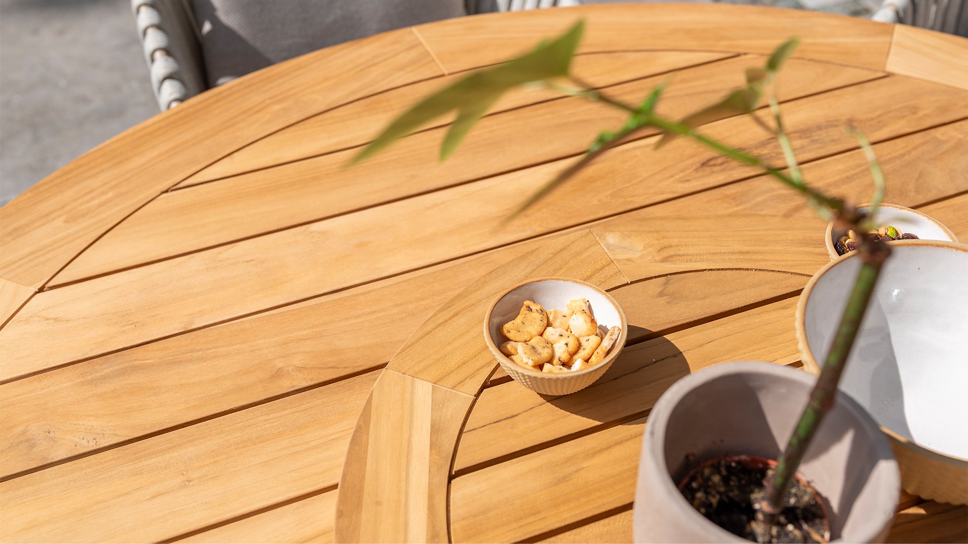 Teak is a natural product and particularly suitable for outdoor use. It is resistant to pests and mold and can withstand sun, rain, and snow. Over time, teak develops a silver-gray patina. Teak is a robust material and requires little maintenance. If you prefer the original color of your teak, you can easily prevent it from turning gray by regularly using our care product. You can also clean teak with green soap. We offer a warranty on all manufacturing and construction defects. This does not include the working of teak. When you choose teak, we expect you to appreciate these qualities. Hairline cracks that may develop, knots in the teak, and rough surfaces or irregular discoloration over time are not covered by our warranty. These characteristics give teak its unique character and appearance; they are part of its natural properties. Be careful with a flowerpot or vase on your teak garden table, as this can cause persistent rings or color variations. Imperfections are common; these imperfections are characteristic of this product. These irregularities can never give ground to a claim, warranty, or complaint. This is a signs ans signature of originality!