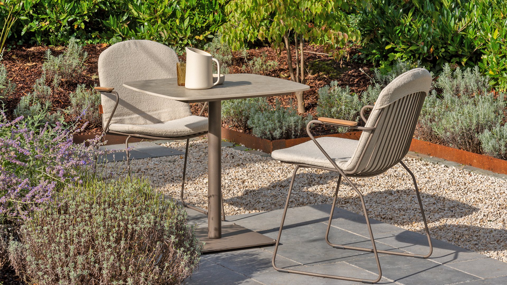 In many garden furniture models we coat the stainless steel in a matte anthracite colour for a neutral appearance and better weather resistance so that hardly any maintenance is required.  Color-powder-coated stainless steel is virtually maintenance-free; any paint damage must be touched up.
