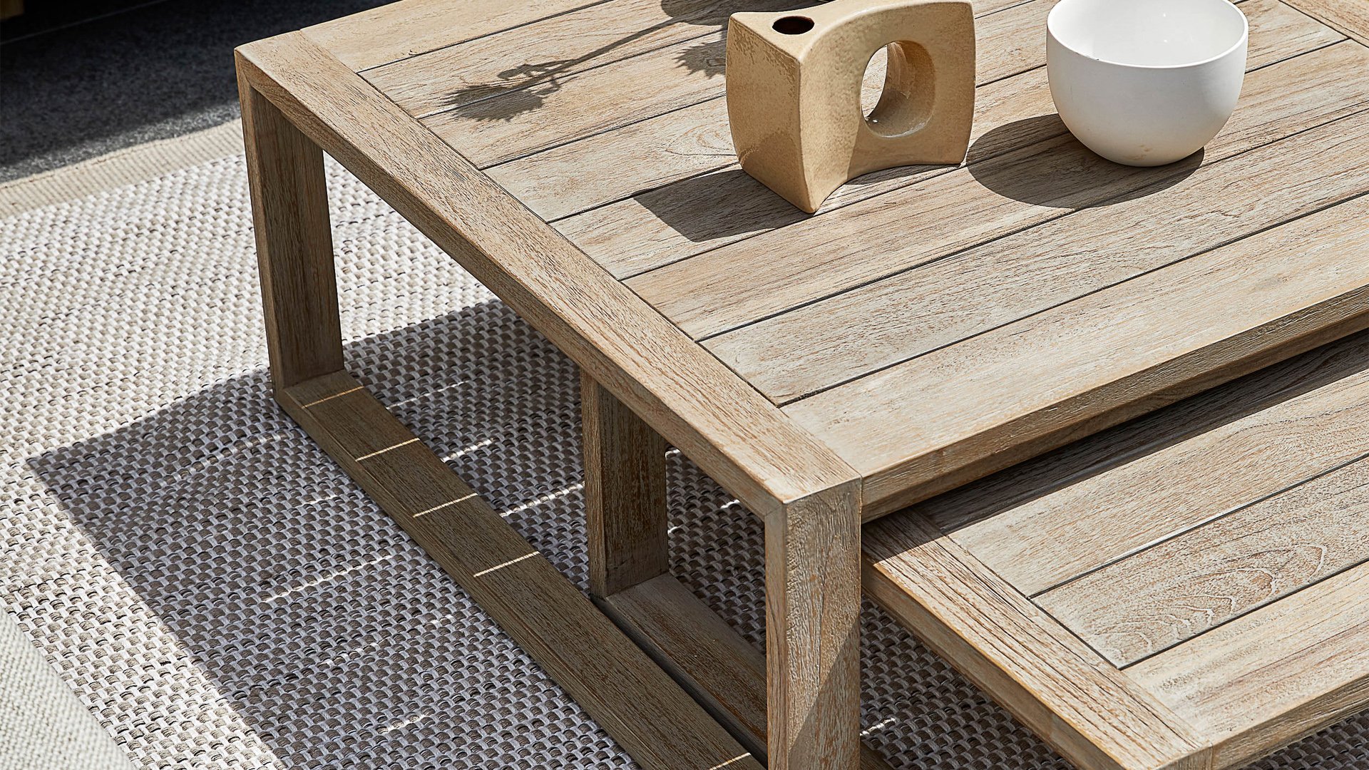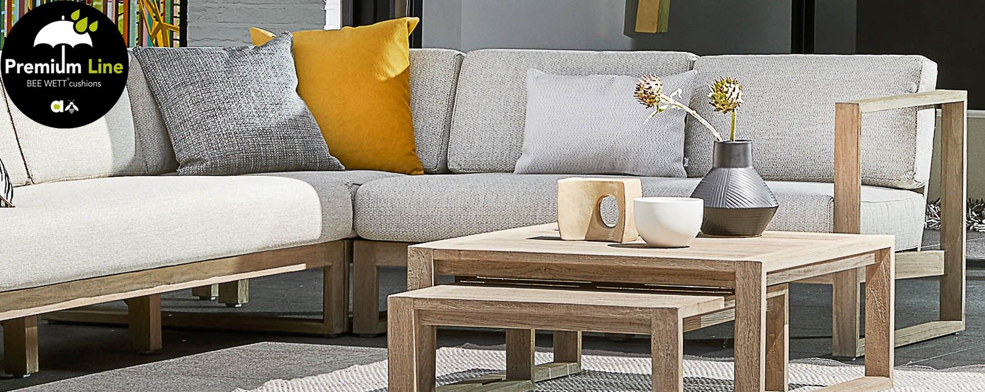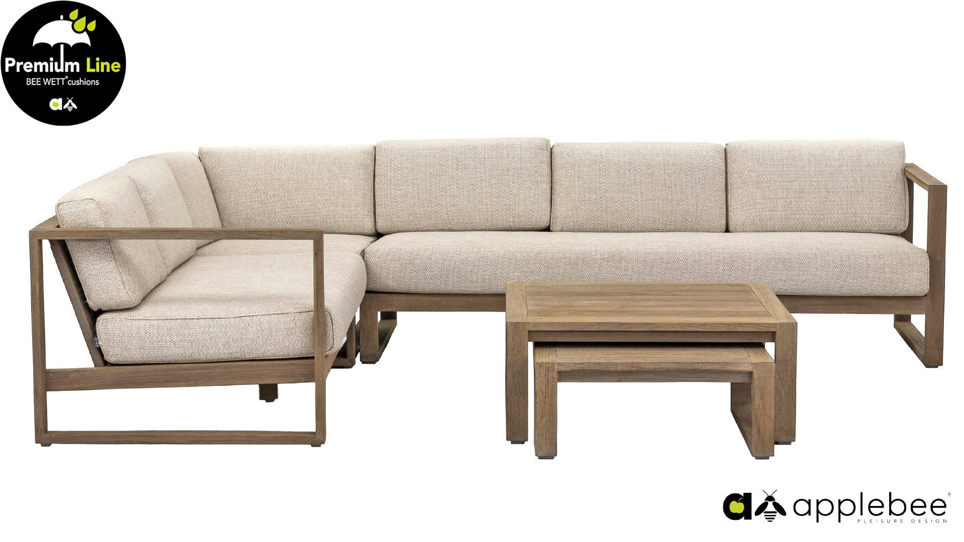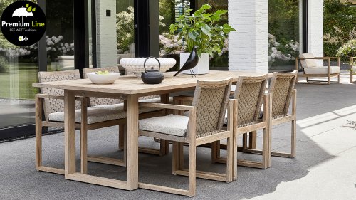 The Apple Bee Antigua collection consists of a dining set, lounge set, and sunbed. This Antigua furniture collection is made of teak wood with a coastal color finish and braiding of true craftsmanship. The extremely thick cushions in the color 'natural oak' ensure complete relaxation and are water and weather resistant thanks to our own technology. You can arrange the furniture completely to your own liking! There is also a set of two coffee tables that you can place wherever you like.