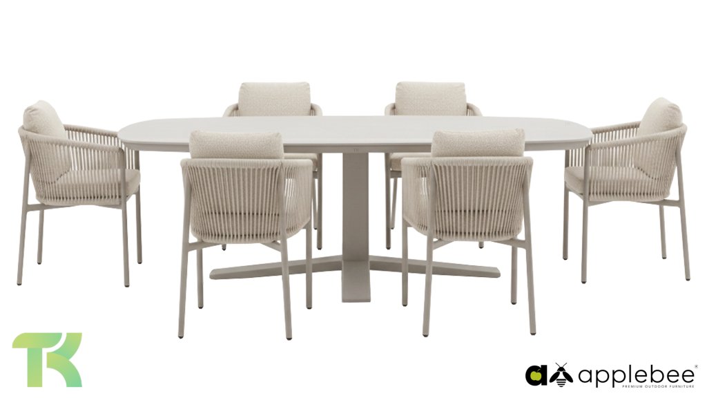 At Apple Bee, we use Rope as a high-quality weaving material for our outdoor furniture. This specially developed rope is strong, durable, easy to maintain, quick-drying, and UV-resistant, preventing it from fading in the sun. Rope consists of water-resistant, soft fibers made from the same material as our Olefin fabrics, woven around a strong, PVC-coated polyester core. This ensures excellent comfort, even without cushions. Cleaning is simple: remove loose dirt, clean with a mild detergent and water, rinse thoroughly, and let the furniture dry completely. Regular maintenance keeps the furniture in optimal condition.