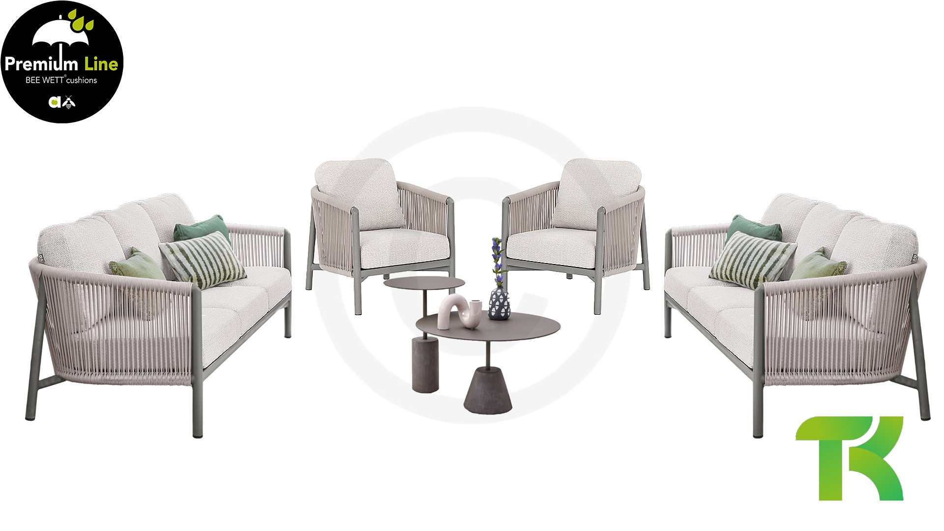 The Apple Bee Bora Bora Lounge collection is minimalist, elegant, and clean. It is characterized by the two-layer braided rope, which you can see through. The fine, curved shapes of this furniture create a sleek yet elegant appearance. In combination with the harmonious interplay of taupe colors and the rope, the luxurious Bora Bora is a beautiful addition to the garden. Of course, this lounge set is also equipped with the Bee Wett® cushions. These Bee Wett® cushions are specially weather-resistant cushions. The open weave on the underside of the cushion ensures perfect drainage. This allows your Bee Wett cushion to dry spectacularly faster than other cushions. Additionally, the fabric is resistant to rot and mold, UV resistant, moisture repellent, soft, and comfortable.