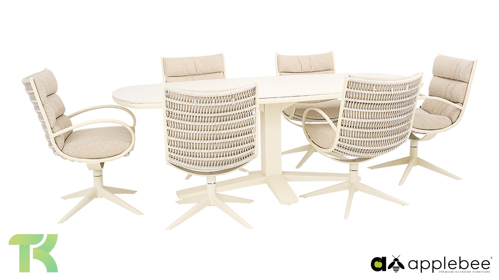 The Apple Bee Camp Bay Oyster: fresh, elegant, and comfortable. This dining set combines a refined, light color palette with smart functionality, allowing you to enjoy unparalleled comfort on long summer evenings. The organic shapes and soft hues create a haven of tranquility in the garden, while the robust materials ensure years of enjoyment.