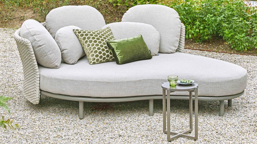 The daybed is available in two colors: Taupe and Oyster, both neutral shades that easily combine with various garden styles and colors. The backrest sections are equipped with panels made of rope wire, a material that is both durable and breathable. The cushions of the Chill Out daybed are in Smoked Grey, a subtle, light gray tone that exudes a luxurious and refined atmosphere. The cushions are made of Olefin, a material known for its excellent resistance to weather, as well as its high comfort and durability, ideal for outdoor use.
