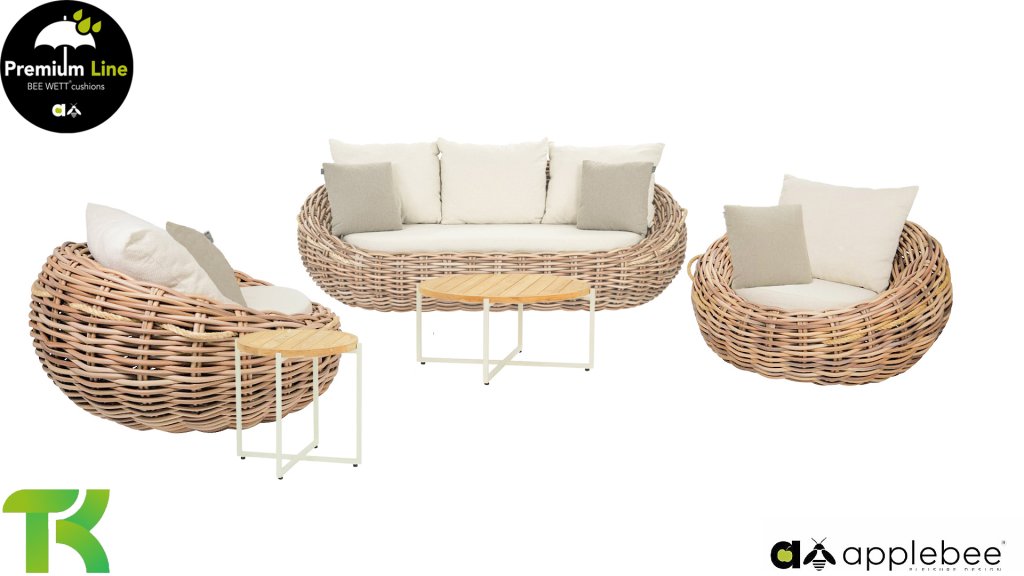 Apple Bee is characterized by the use of special Biculair® wickerwork, originally developed for professional applications in the hospitality industry. This Biculair® wickerwork is a lifelike, sustainable alternative to rattan. This highly durable synthetic rattan fiber (HDPE) is completely weatherproof, colorfast, recyclable, and therefore an environmentally friendly choice. The appearance and performance of the furniture remain unaffected by European weather conditions, and the colors retain their natural vibrancy. The superior quality of this wickerwork, verified by the Netherlands Organisation for Applied Scientific Research (TNO), is clearly demonstrated compared to other comparable materials.