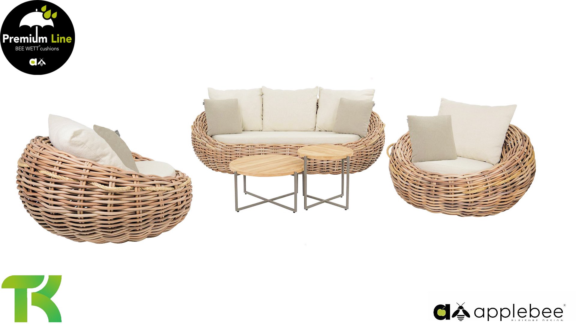 Apple Bee is characterized by the use of special Biculair® wickerwork, originally developed for professional applications in the hospitality industry. This Biculair® wickerwork is a lifelike, sustainable alternative to rattan. This highly durable synthetic rattan fiber (HDPE) is completely weatherproof, colorfast, recyclable, and therefore an environmentally friendly choice. The appearance and performance of the furniture remain unaffected by European weather conditions, and the colors retain their natural vibrancy. The superior quality of this wickerwork, verified by the Netherlands Organisation for Applied Scientific Research (TNO), is clearly demonstrated compared to other comparable materials.