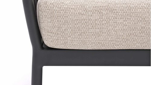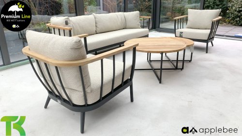 The Apple Bee Condor Lounge Black has a sleek, rugged look. The base material is matte black powder-coated aluminum. The BEE WETT® cushions have a coarse weave structure, but with a soft touch. The beautiful curves in the back and the use of natural teak wood in the armrests give the Condor a pleasant touch of natural warmth.