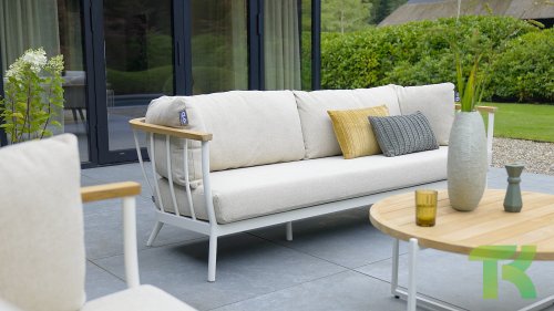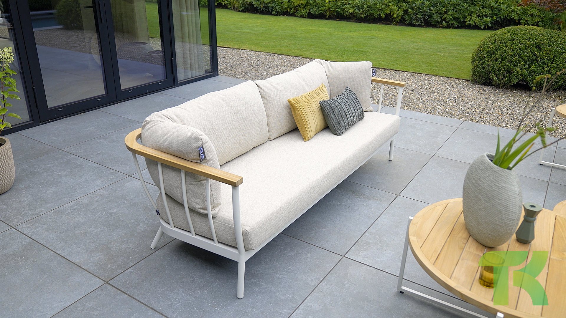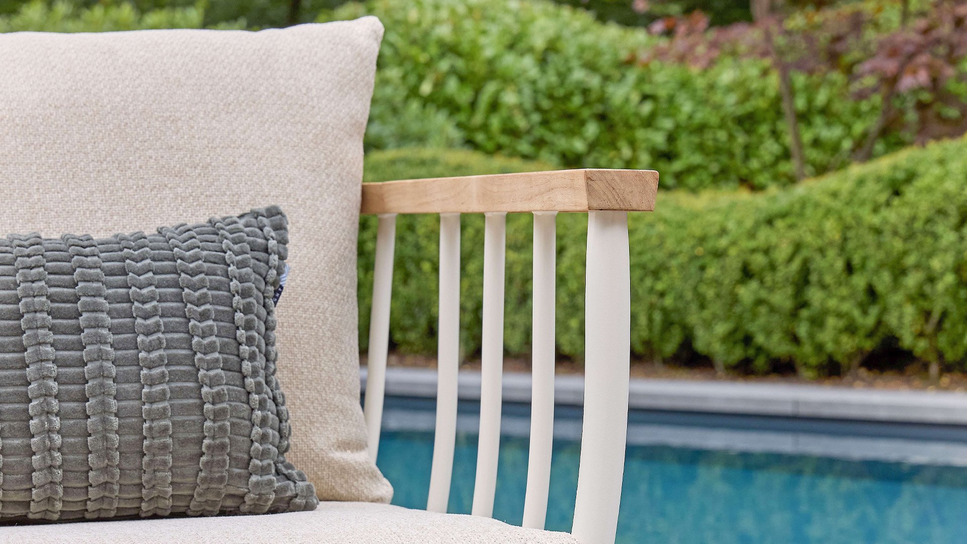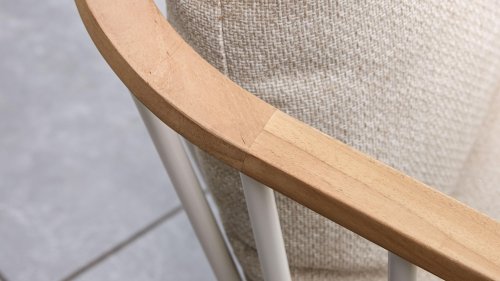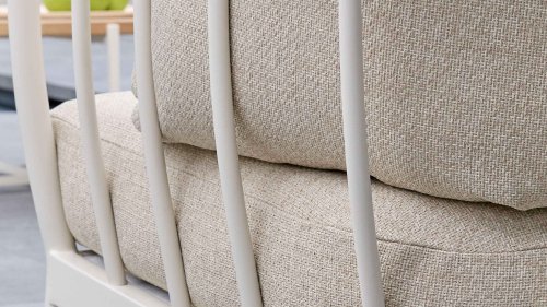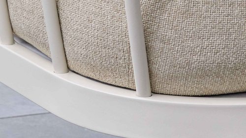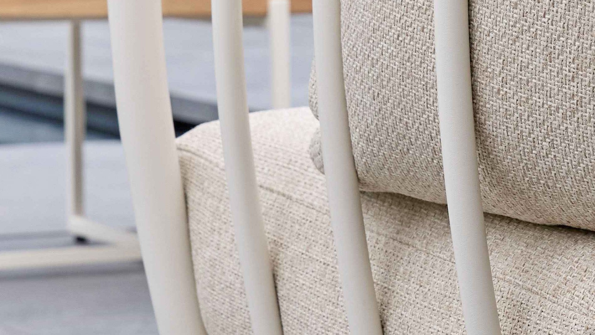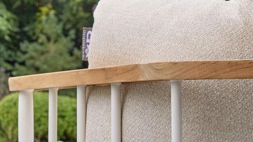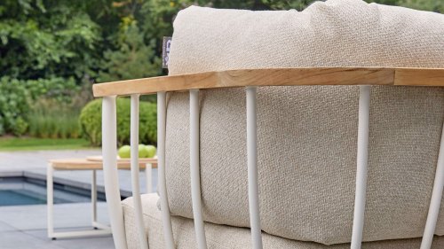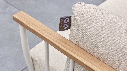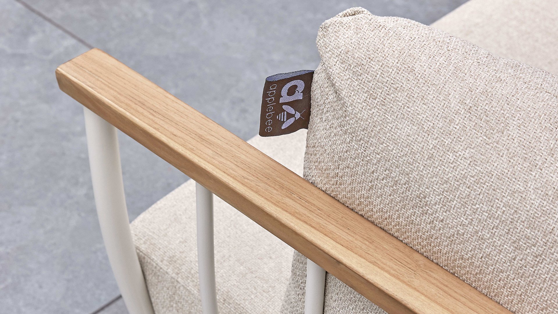 The Apple Bee Condor Lounge Oyster has a sleek, robust look. The base material is Oyster colored powder-coated aluminum. The BEE WETT® cushions have a coarse weave structure, but with a soft touch. The beautiful curves in the back and the use of natural teak wood in the armrests give the Condor a pleasant touch of natural warmth.