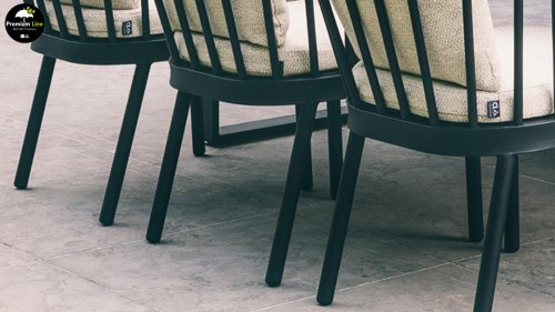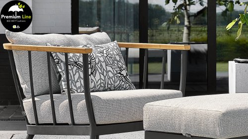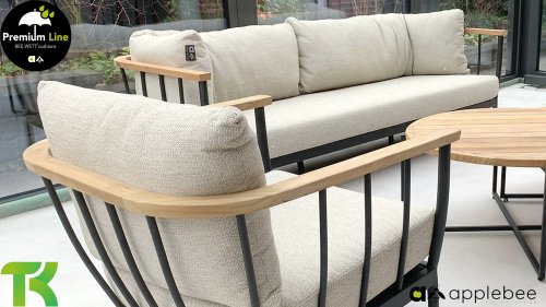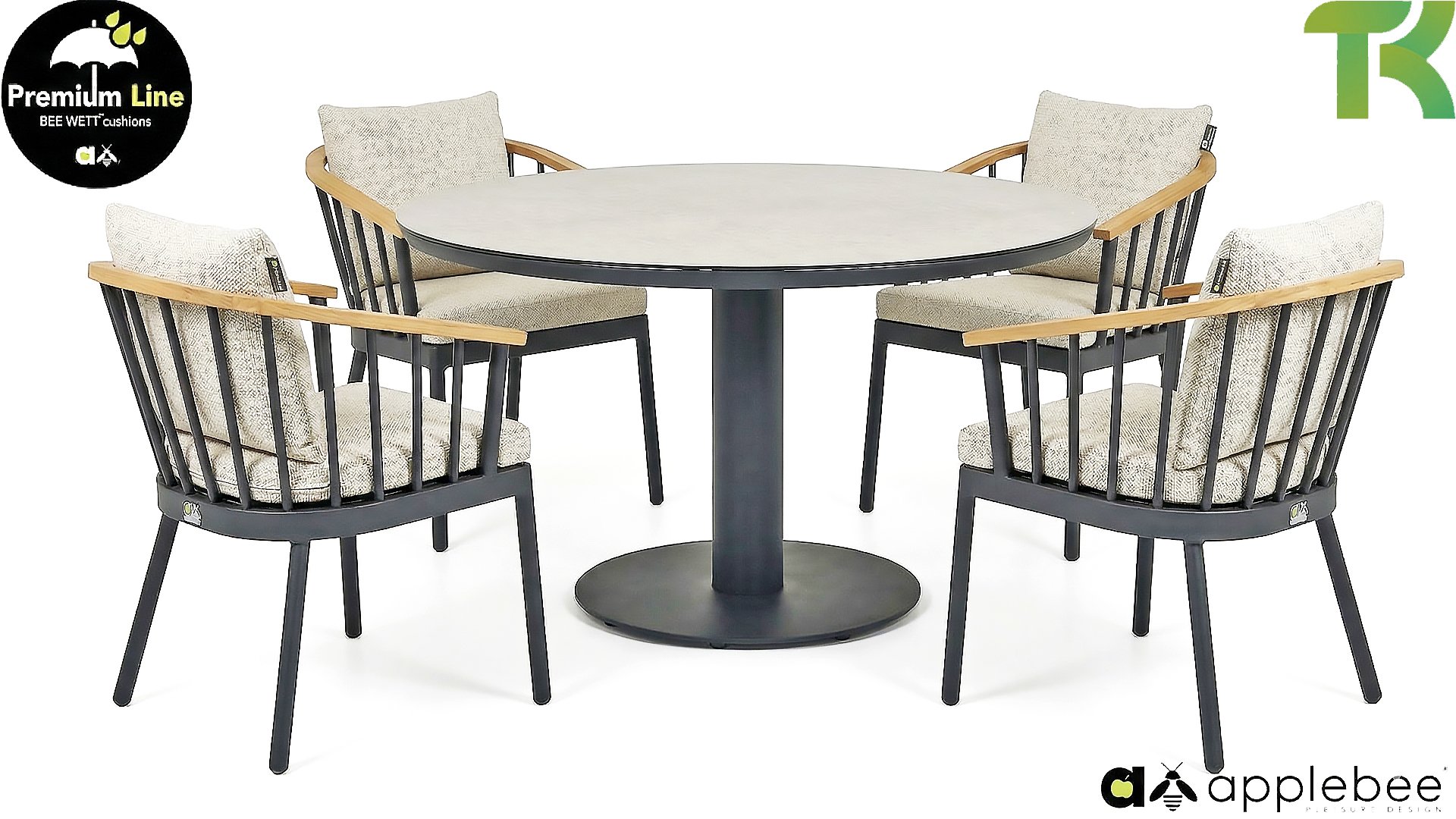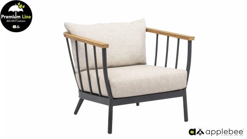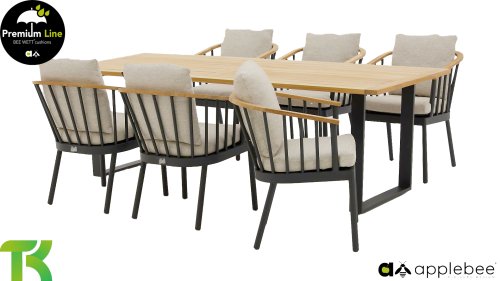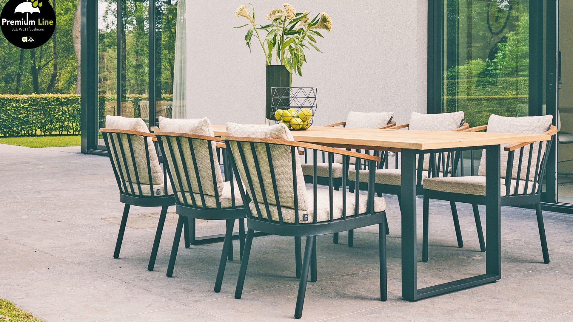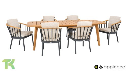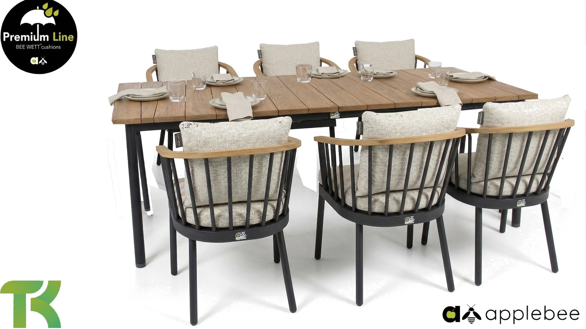 The Apple Bee Condor dining set has a sleek, robust look. This is reflected in both the chair and the table base. The set's base is made of matte black powder-coated aluminum, which is used in robust dimensions. The BEE WETT® cushions have a coarse weave, yet offer a soft touch for optimal comfort. Combined with the beautiful curves in the chair's back and the use of natural teak in the tabletop and armrests, the Apple Bee Condor still has a pleasant touch of natural warmth.
