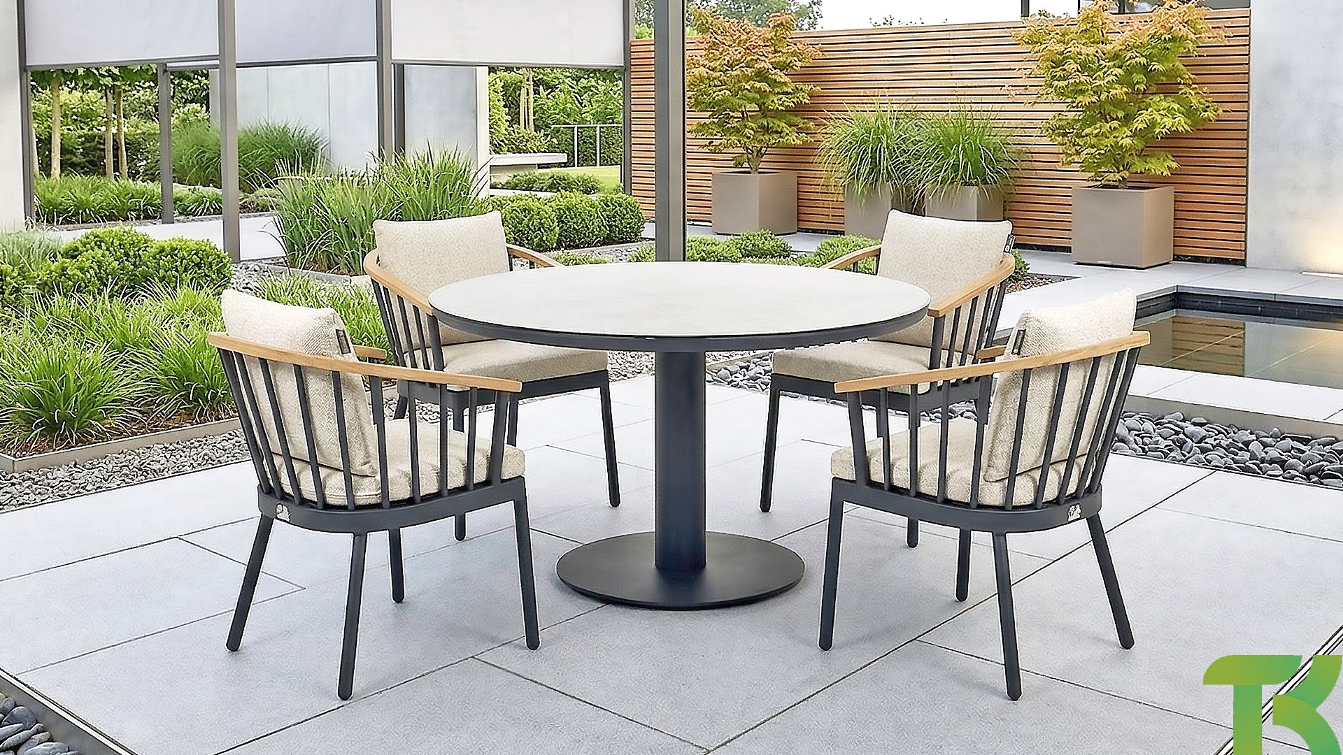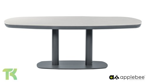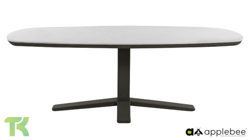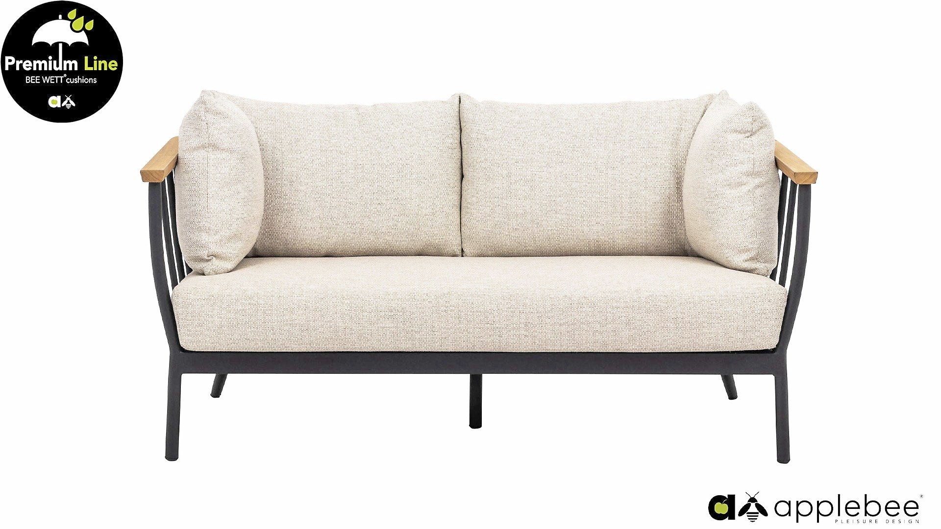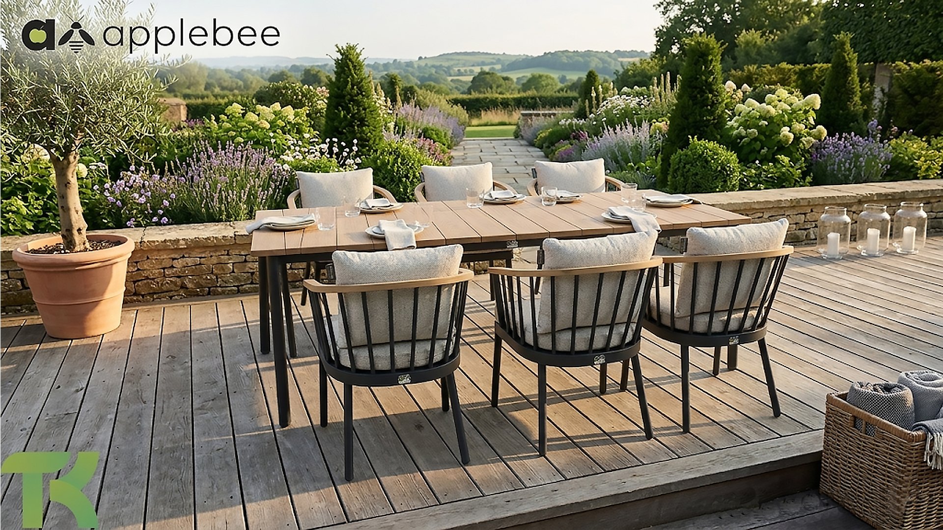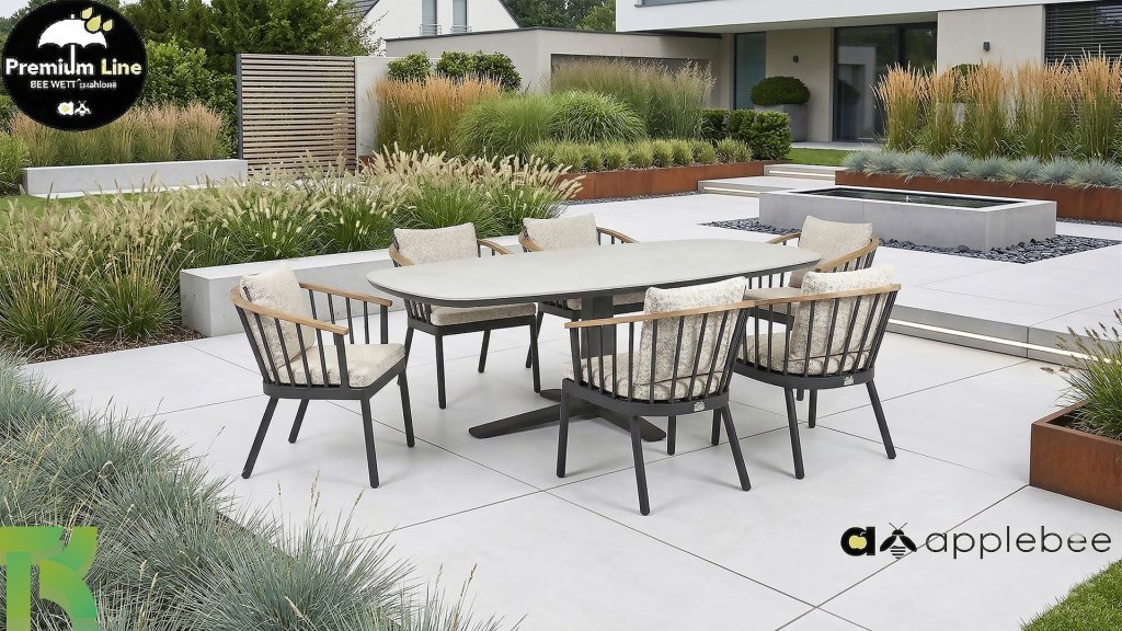 The Apple Bee Condor dining set has a sleek, robust look. This is reflected in both the chair and the table base. The set's base is made of matte black powder-coated aluminum, which is used in robust dimensions. The BEE WETT® cushions have a coarse weave, yet offer a soft touch for optimal comfort. Combined with the beautiful curves in the chair's back and the use of natural teak in the tabletop and armrests, the Apple Bee Condor still has a pleasant touch of natural warmth.