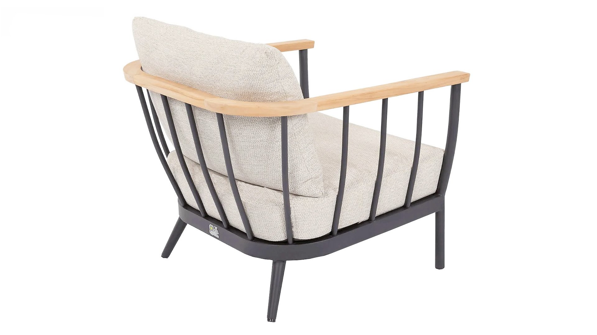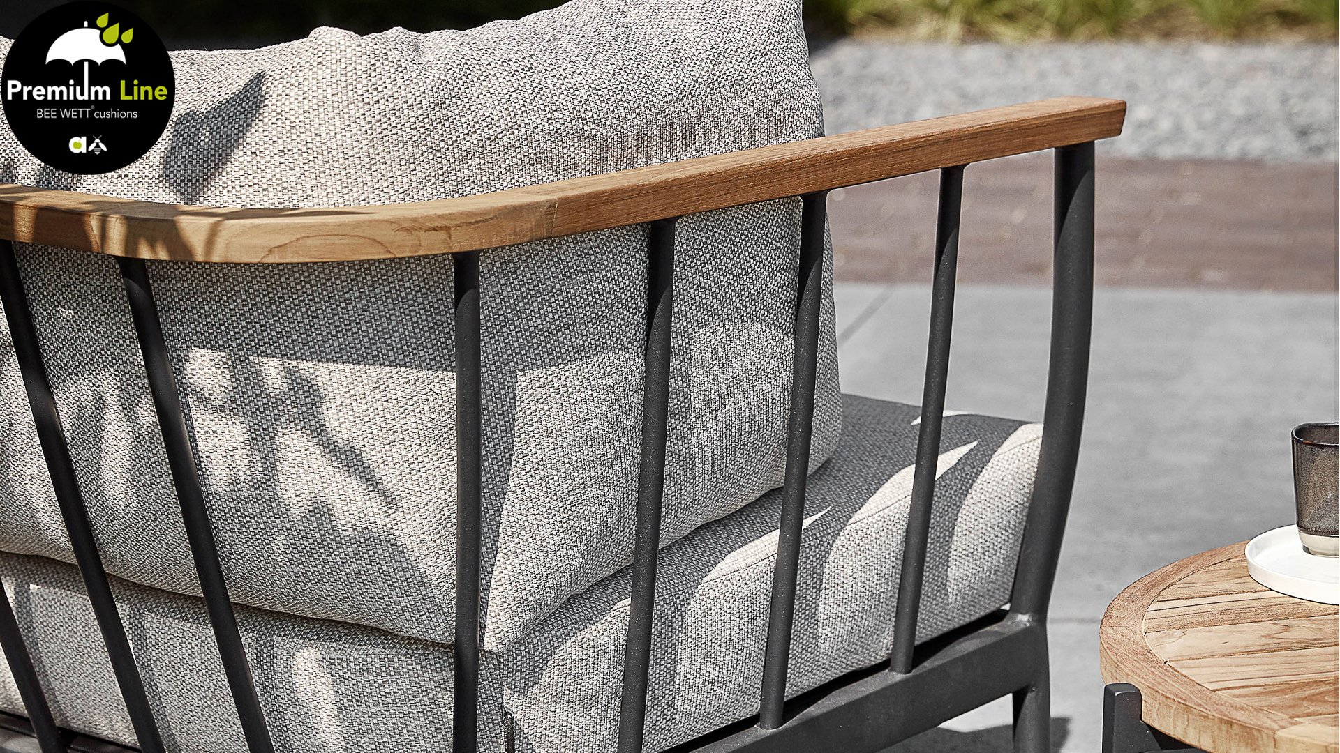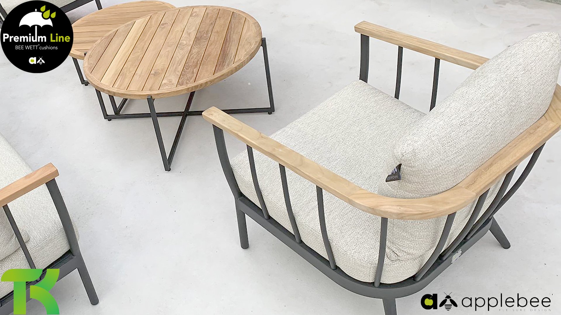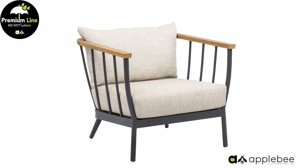The Apple Bee Condor Lounge Black has a sleek, rugged look. The base material is matte black powder-coated aluminum. The BEE WETT® cushions have a coarse weave structure, but with a soft touch. The beautiful curves in the back and the use of natural teak wood in the armrests give the Condor a pleasant touch of natural warmth.