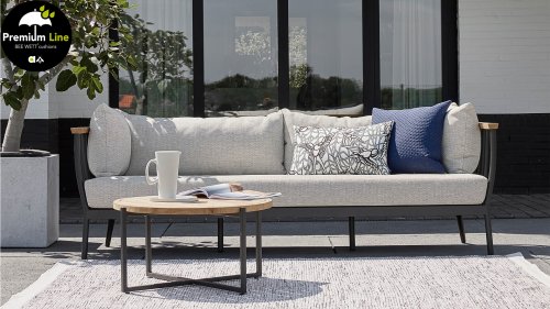 The Apple Bee Condor Lounge Black has a sleek, rugged look. The base material is matte black powder-coated aluminum. The BEE WETT® cushions have a coarse weave structure, but with a soft touch. The beautiful curves in the back and the use of natural teak wood in the armrests give the Condor a pleasant touch of natural warmth.