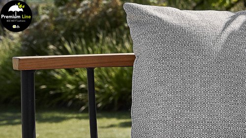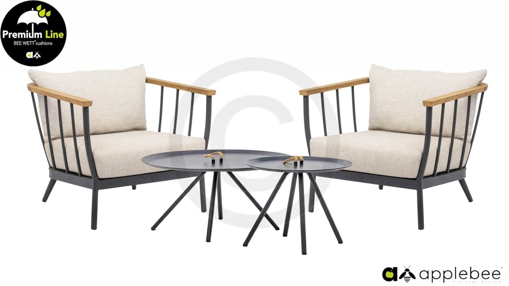 The Apple Bee Condor Lounge Black has a sleek, rugged look. The base material is matte black powder-coated aluminum. The BEE WETT® cushions have a coarse weave structure, but with a soft touch. The beautiful curves in the back and the use of natural teak wood in the armrests give the Condor a pleasant touch of natural warmth.