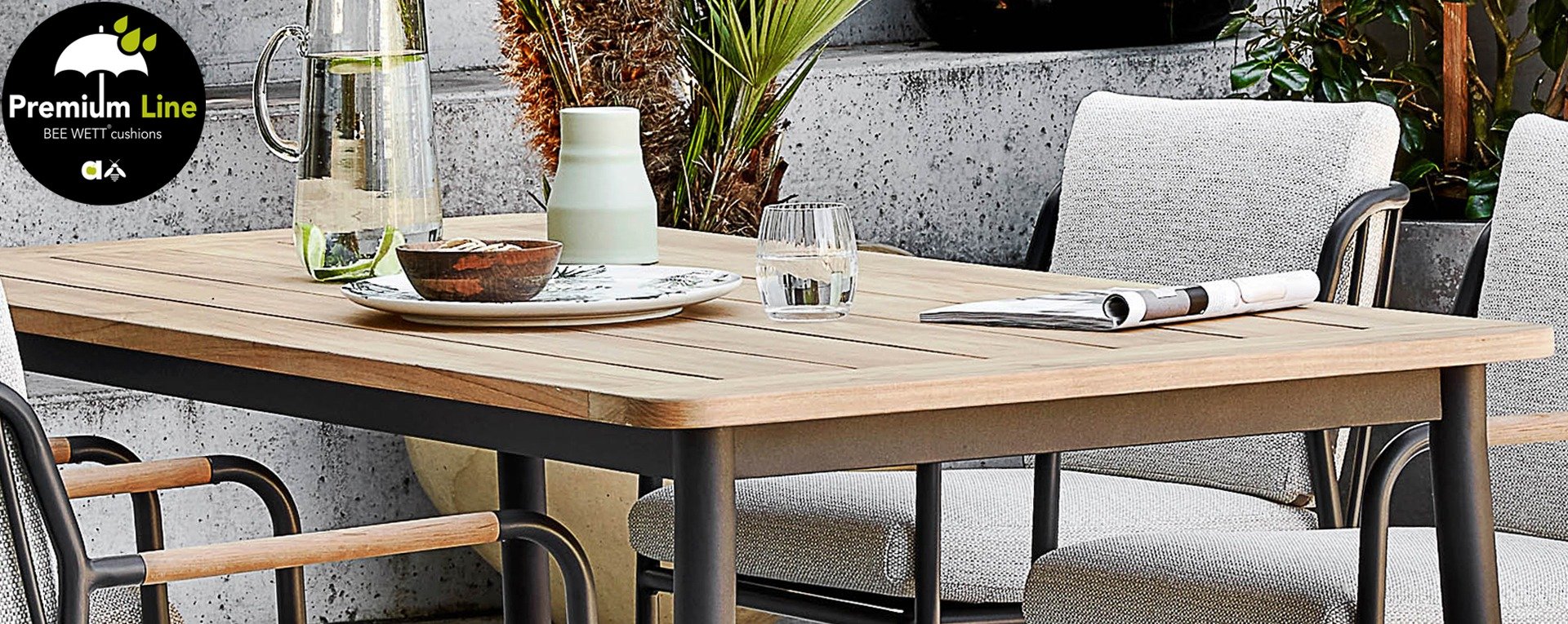 In the Premium Line, the cushions are equipped with Bee Wett® technology, which ensures that the cushions dry quickly after a heavy rain shower. You can simply leave the cushions outside. The drainage at the bottom of the cushion allows water to easily exit.