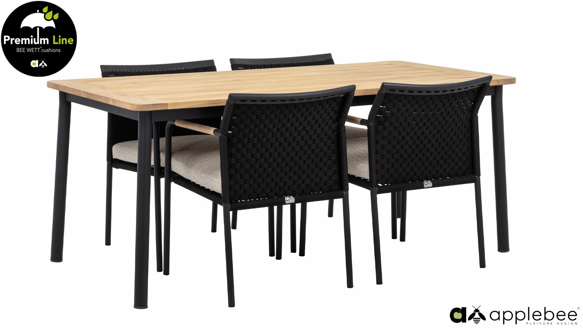 The clever lines make this Apple Bee Elle Rope Dining Set look sleek, while still offering a sea of seating space. The round matte black aluminum tube frame is complemented by a natural teak wooden armrest. The light seat cushion and the teak wood detail in the armrest provide contrast and vibrancy. This garden set has been chosen in combination with dining tables that feature the same mix of matte black aluminum and natural teak wood for a sleek effect.