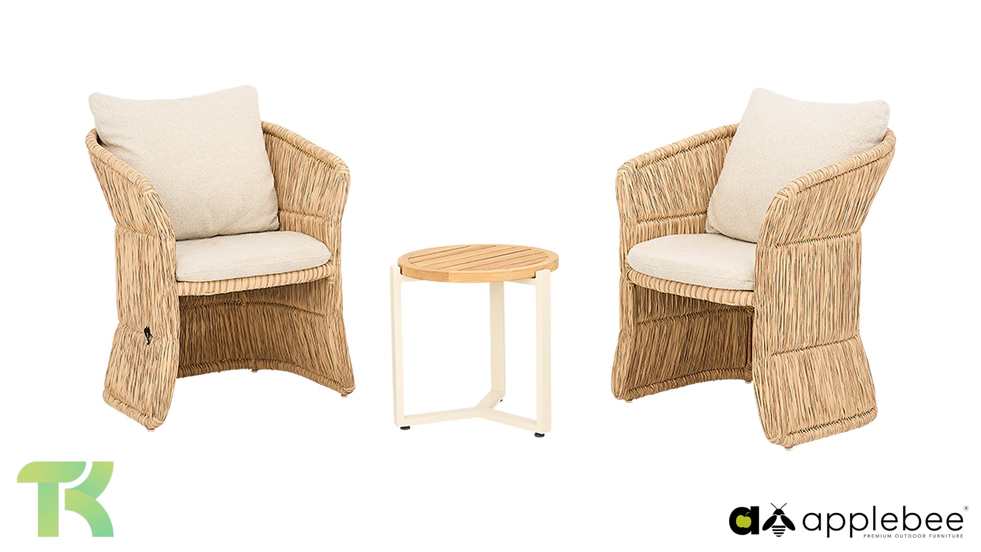 Apple Bee is characterized by the use of special Biculair® wickerwork, originally developed for professional applications in the hospitality industry. This Biculair® wickerwork is a lifelike, sustainable alternative to rattan. This highly durable synthetic rattan fiber (HDPE) is completely weatherproof, colorfast, recyclable, and therefore an environmentally friendly choice. The appearance and performance of the furniture remain unaffected by European weather conditions, and the colors retain their natural vibrancy. The superior quality of this wickerwork, verified by the Netherlands Organisation for Applied Scientific Research (TNO), is clearly demonstrated compared to other comparable materials.