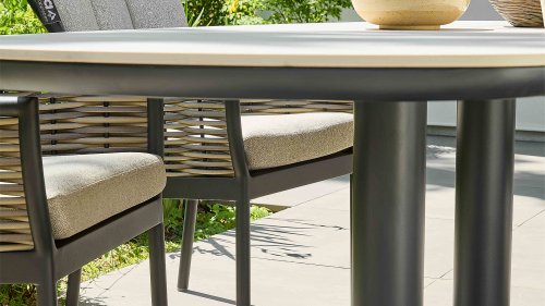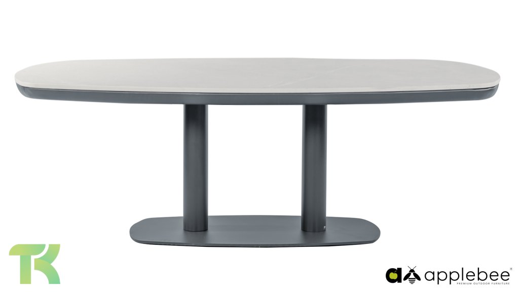 The Melville dining table by Apple Bee is the ultimate masterpiece for the garden or patio. The true eye-catcher is the top, crafted from state-of-the-art Sintered Stone. This innovative material is not only beautiful to look at but also offers ultimate functionality: it is exceptionally scratch, stain, and heat resistant, ideal for intensive use and carefree outdoor living. This premium design is built on a sleek yet extremely stable powder-coated aluminum base.