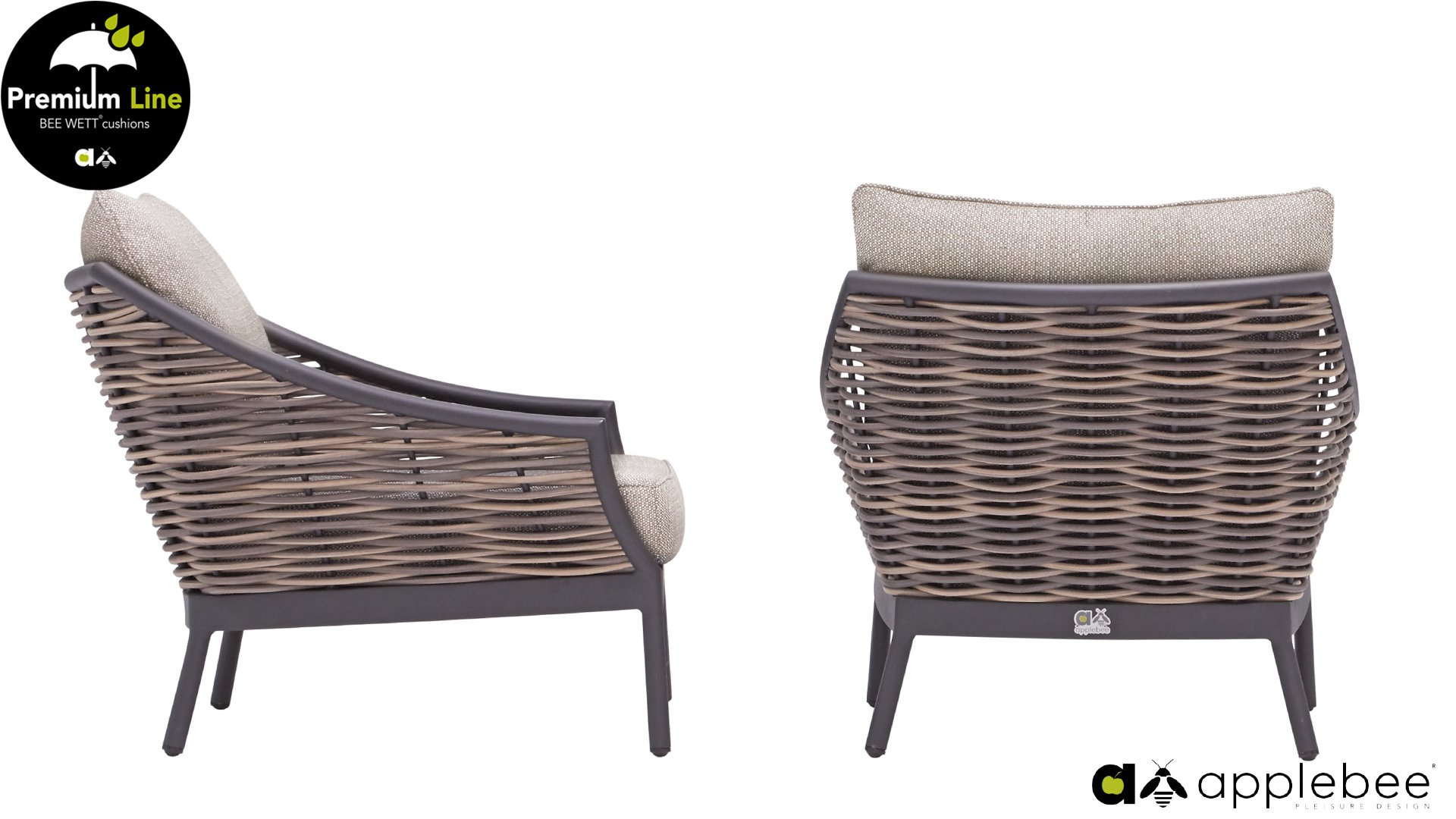 Apple Bee is characterized by the use of special Biculair® wickerwork, originally developed for professional applications in the hospitality industry. This Biculair® wickerwork is a lifelike, sustainable alternative to rattan. This highly durable synthetic rattan fiber (HDPE) is completely weatherproof, colorfast, recyclable, and therefore an environmentally friendly choice. The appearance and performance of the furniture remain unaffected by European weather conditions, and the colors retain their natural vibrancy. The superior quality of this wickerwork, verified by the Netherlands Organisation for Applied Scientific Research (TNO), is clearly demonstrated compared to other comparable materials.