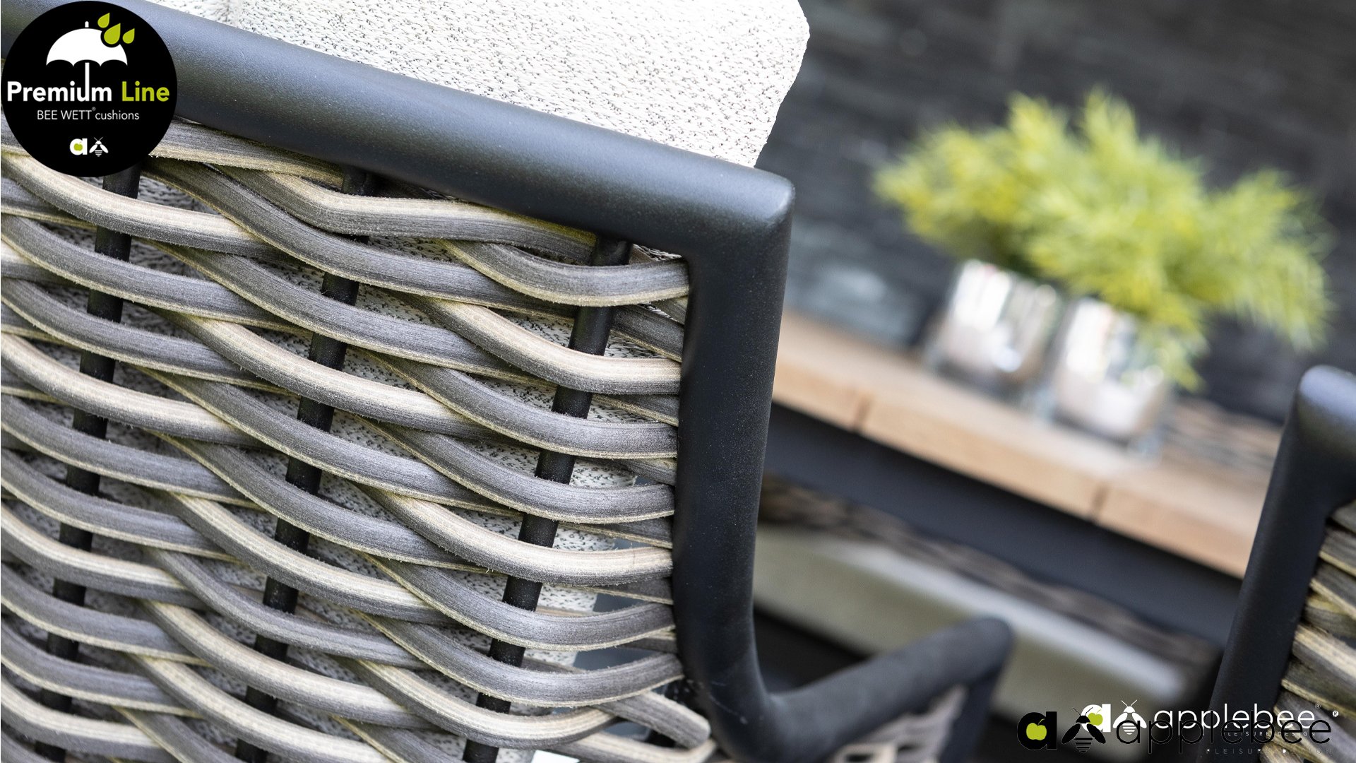 Apple Bee is characterized by the use of special Biculair® wickerwork, originally developed for professional applications in the hospitality industry. This Biculair® wickerwork is a lifelike, sustainable alternative to rattan. This highly durable synthetic rattan fiber (HDPE) is completely weatherproof, colorfast, recyclable, and therefore an environmentally friendly choice. The appearance and performance of the furniture remain unaffected by European weather conditions, and the colors retain their natural vibrancy. The superior quality of this wickerwork, verified by the Netherlands Organisation for Applied Scientific Research (TNO), is clearly demonstrated compared to other comparable materials.
