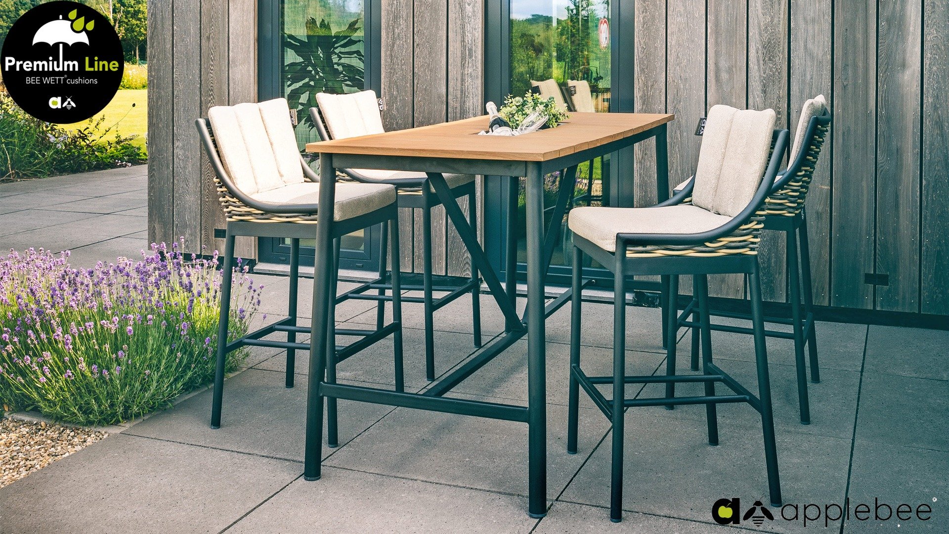 The Apple Bee Milou bar stool has a comfortable seat. This is also due to the good back support. The chair is also equipped with a nice Bee Wett seat and back cushion. Enjoying a meal in the garden, with friends or family? You can do that with this beautiful bar stool.