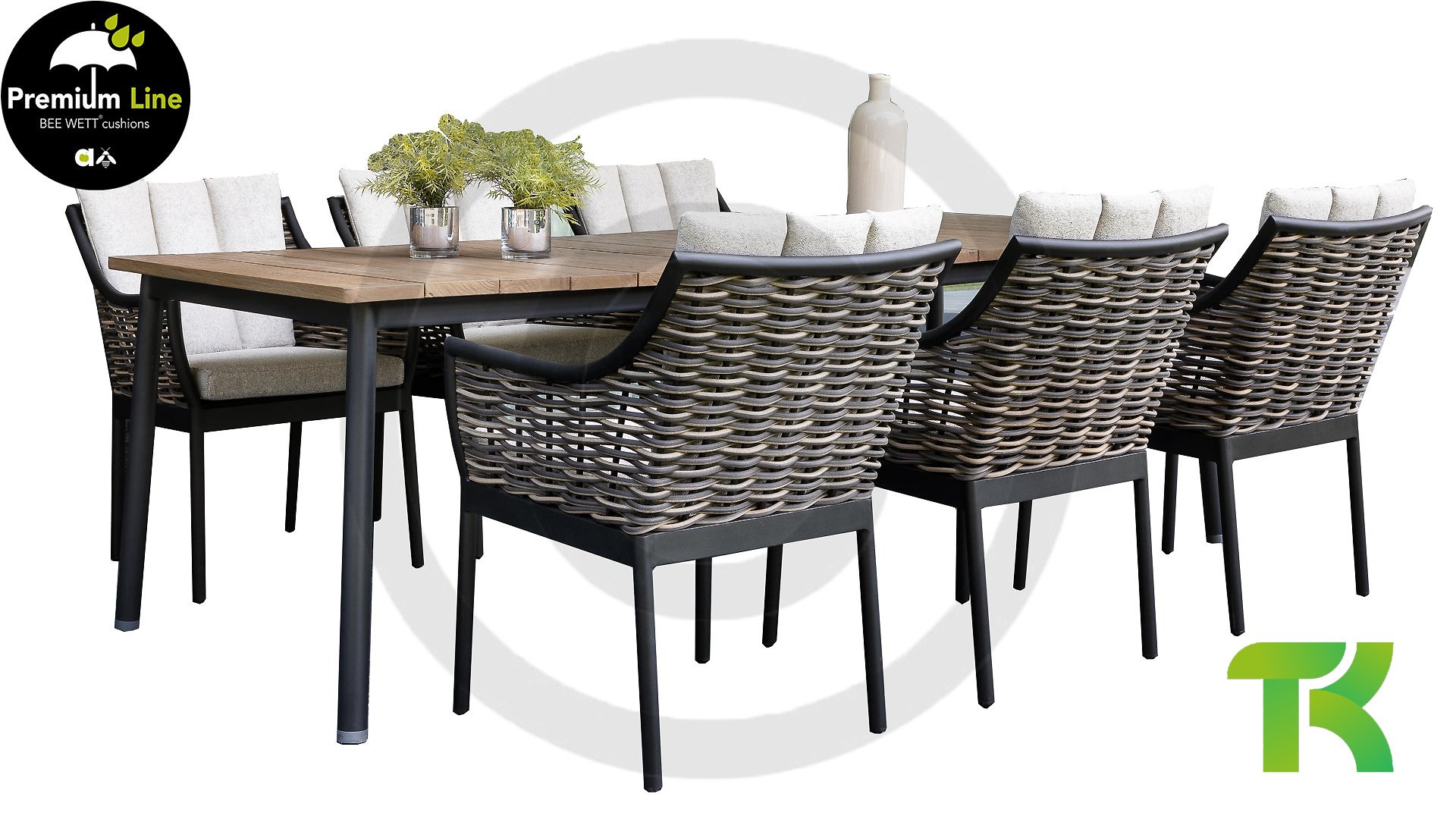 The Apple Bee Milou garden chair, realistic in appearance, but in the well-known sturdy Biculair® outdoor quality that you expect from Apple Bee. This weaving is framed by a black powder-coated frame with curved lines, from which the Milou garden set derives its chic, modern look. In the premium line, the cushions are equipped with Bee Wett® technology, which ensures that the cushions dry quickly after a heavy rain. You can leave the cushions outside without worry. The drainage at the bottom of the cushion allows water to easily escape from the cushions.