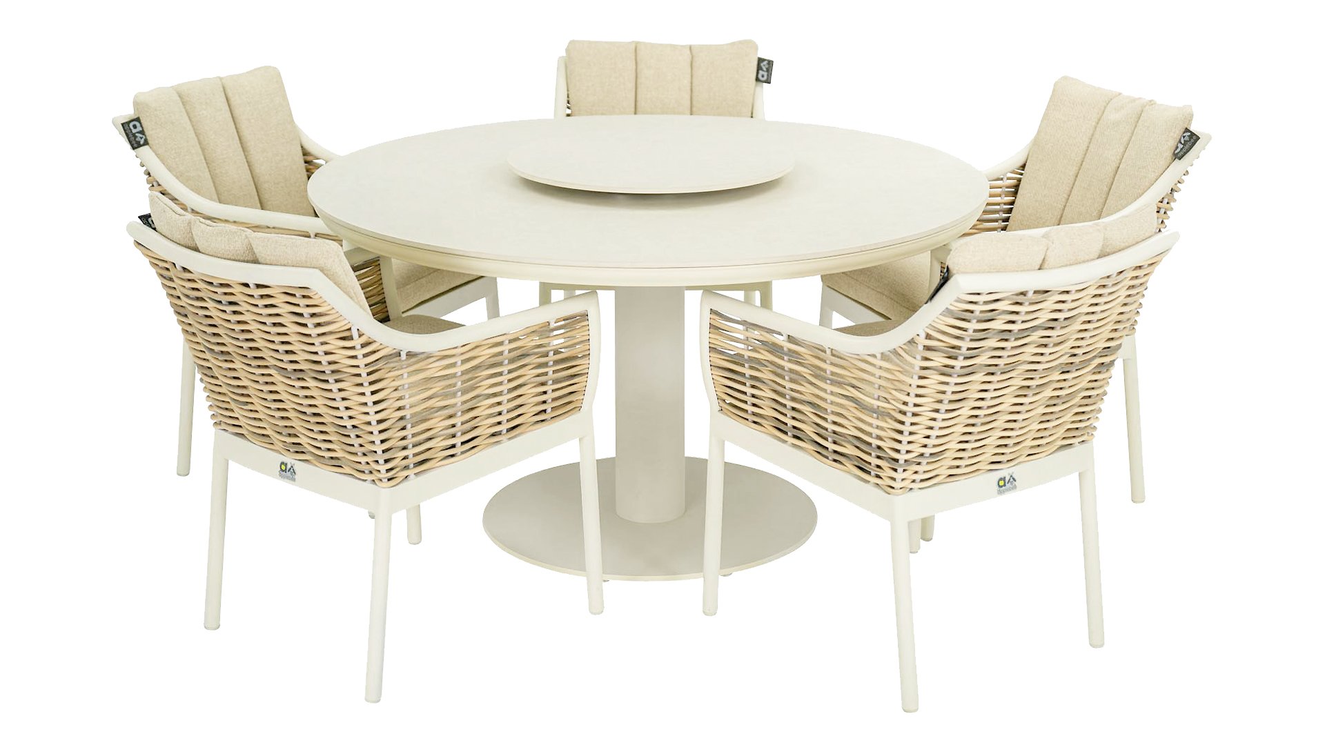 The girl's name Milou means soft and friendly. The wickerwork of the Apple Bee Milou Oyster Dining Set has the appearance of willow. It looks natural, yet retains the familiar, sturdy Biculair® outdoor quality you expect from Apple Bee. This wickerwork is framed by a oyster, powder-coated frame with curved lines, giving the Milou patio set its chic, modern look.